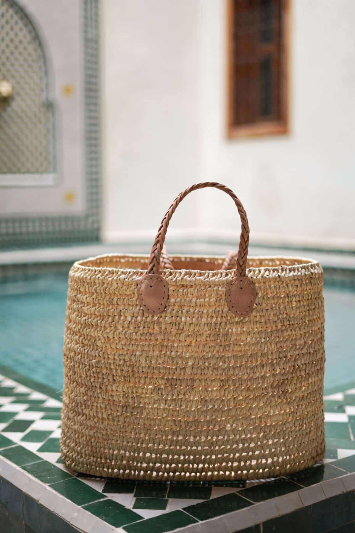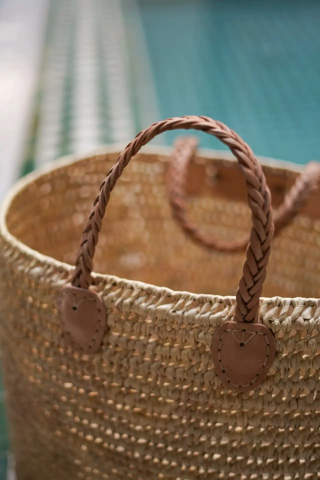 This beautifully handcrafted woven basket is made from natural straw, featuring sturdy leather handles for comfortable carrying. Its spacious design makes it perfect for shopping, picnics, or everyday use. Elegant and practical, it adds a rustic charm to any outfit or home décor.