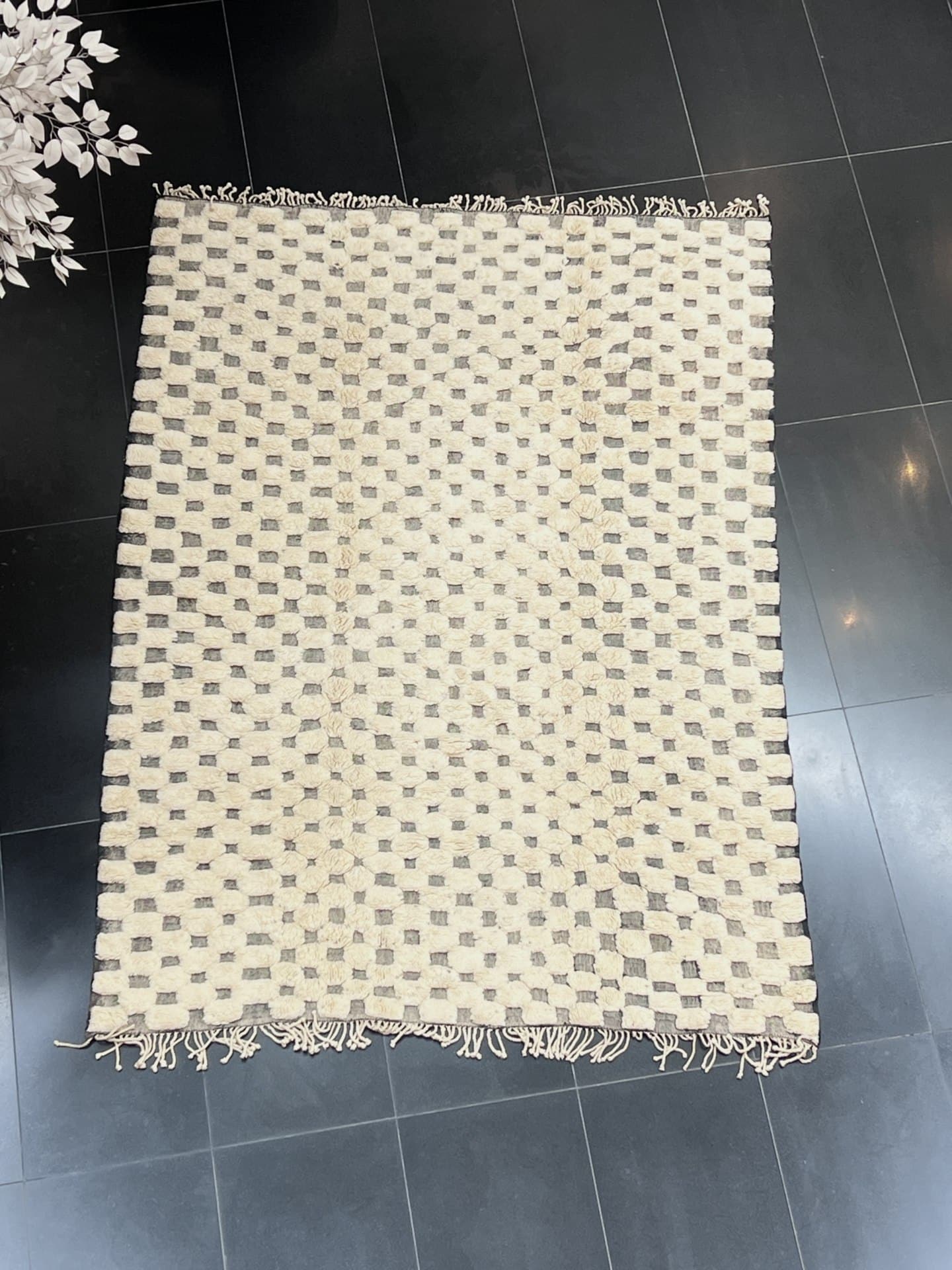 This authentic Beni Mrirt rug is handwoven in Morocco using high-quality wool. It features a modern yet traditional design with a soft, plush texture and an abstract grid pattern in neutral tones. Perfect for adding warmth and sophistication to any space.