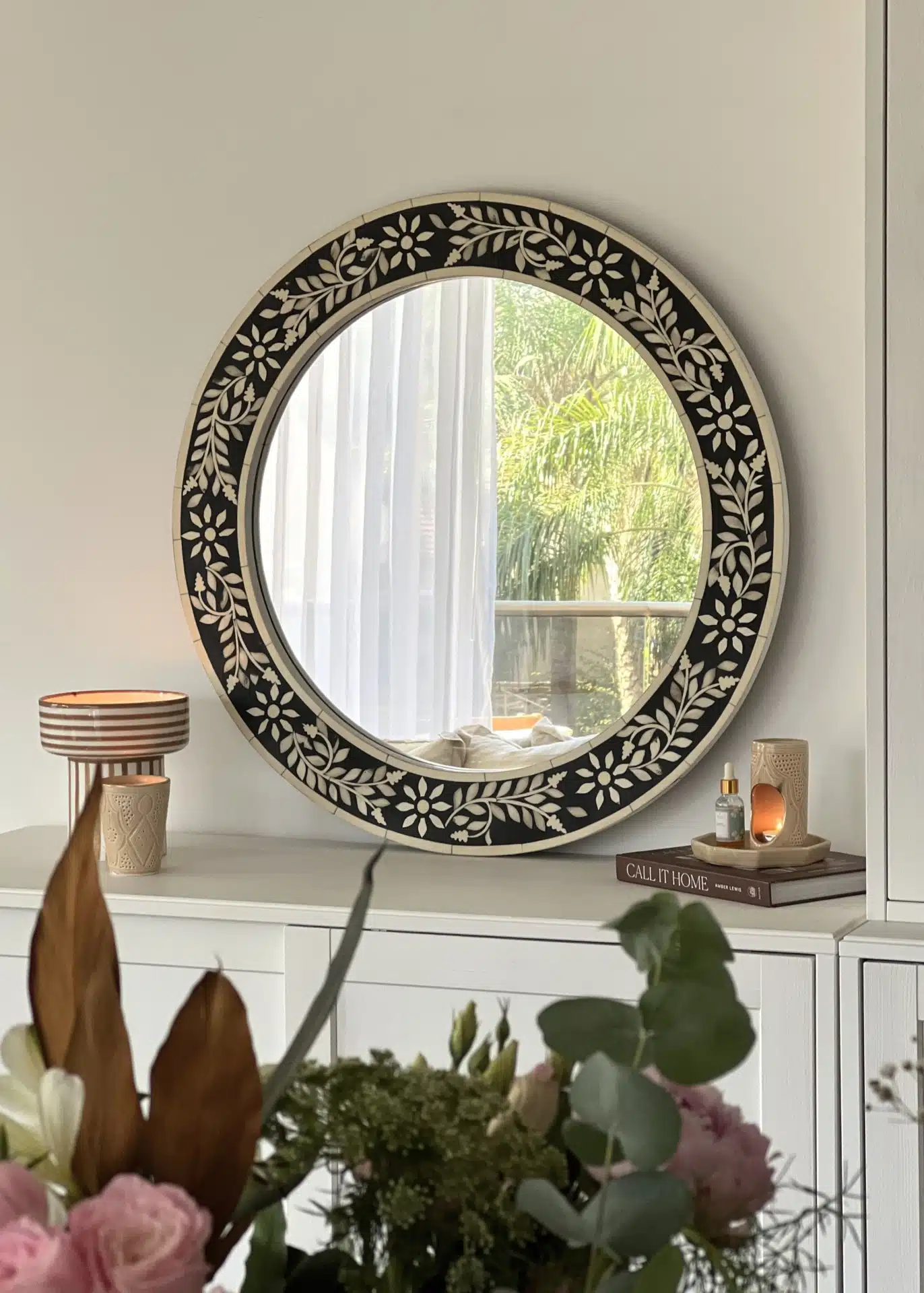 Captivating round bone inlay mirror. every piece is meticulously inlaid by hand, forming a rich floral pattern full of depth, harmony, and natural elegance. Perfect for entryways, above a console, or any space that calls for a touch of unique beauty.