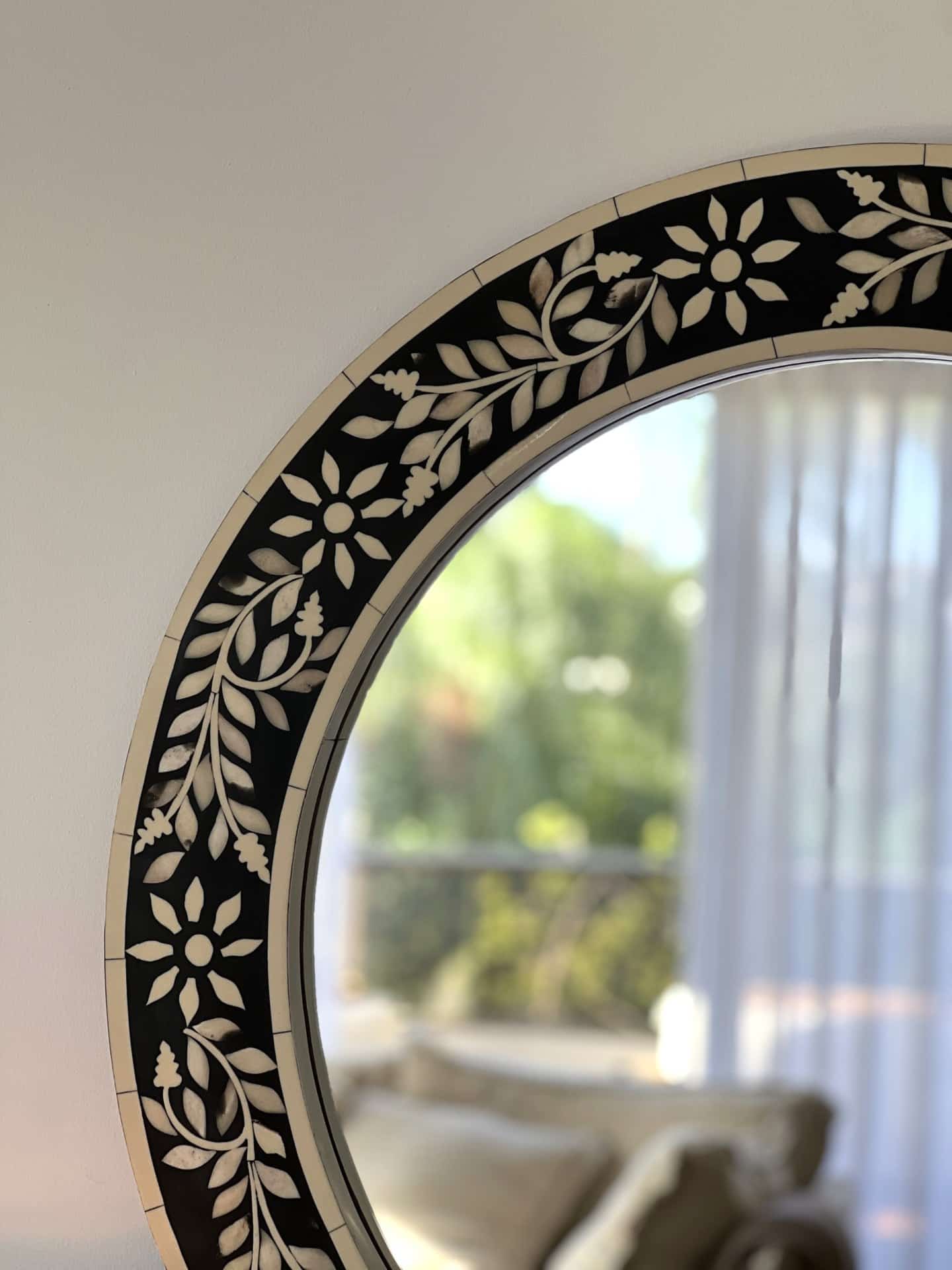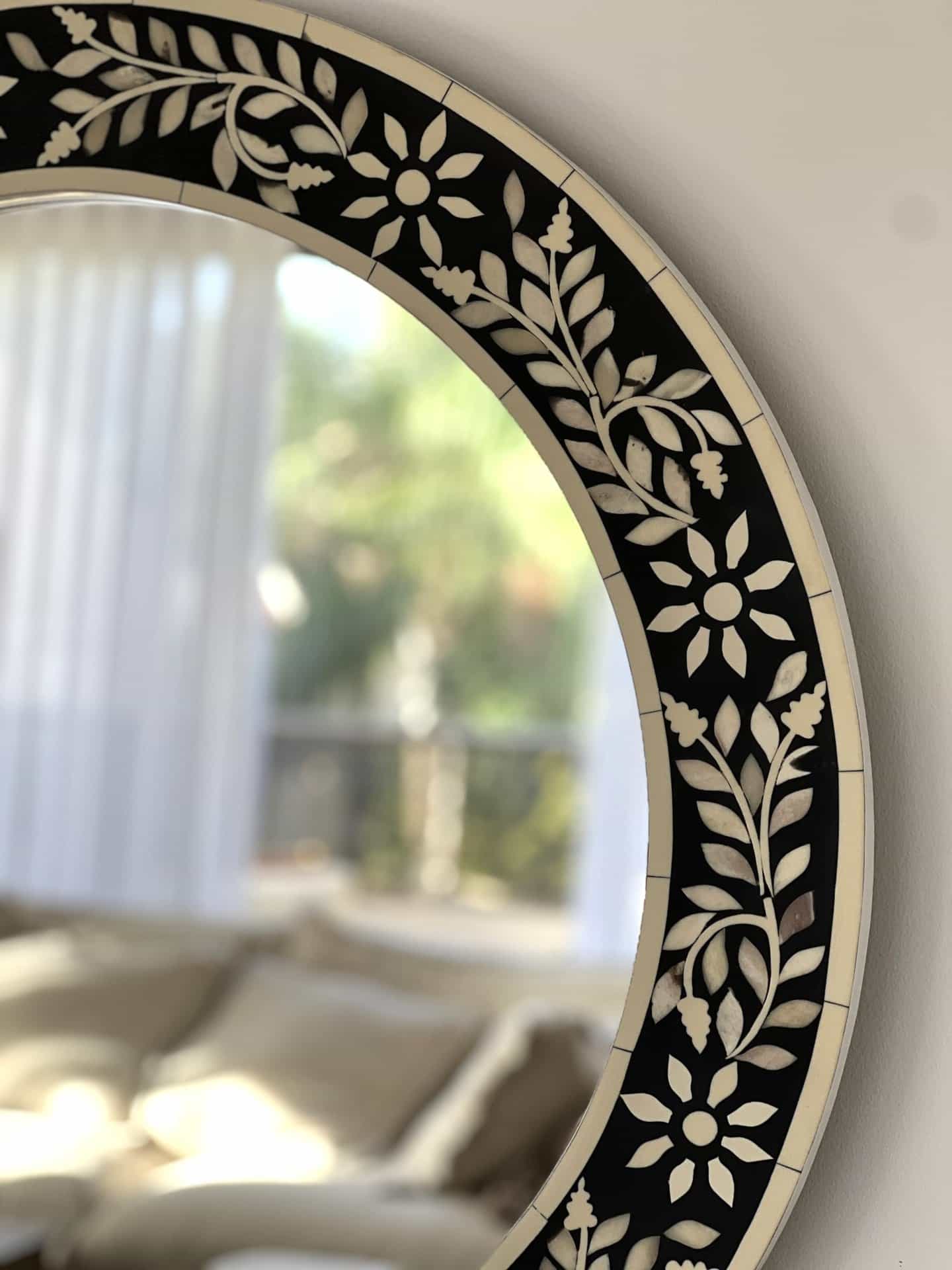Captivating round bone inlay mirror. every piece is meticulously inlaid by hand, forming a rich floral pattern full of depth, harmony, and natural elegance. Perfect for entryways, above a console, or any space that calls for a touch of unique beauty.