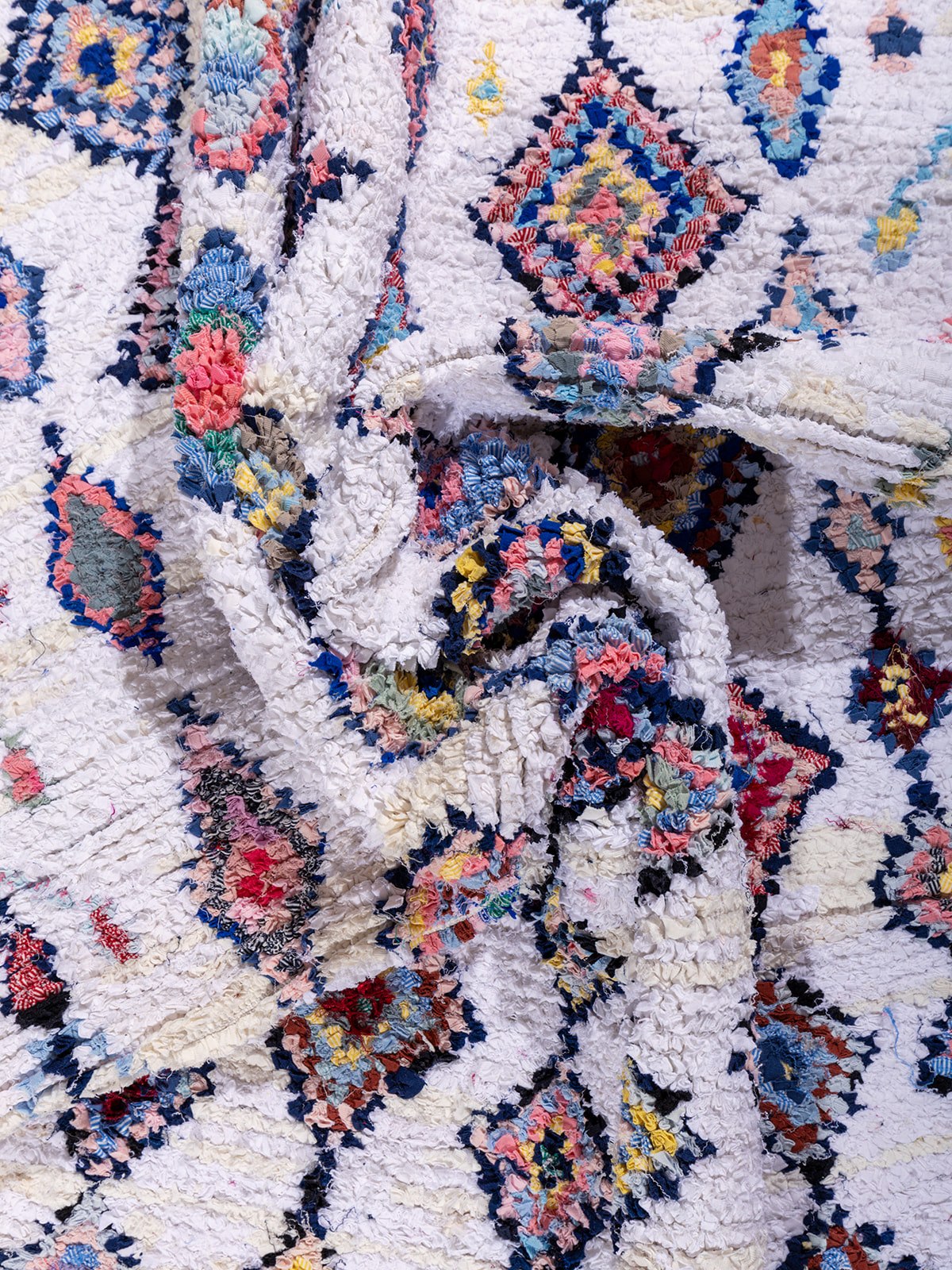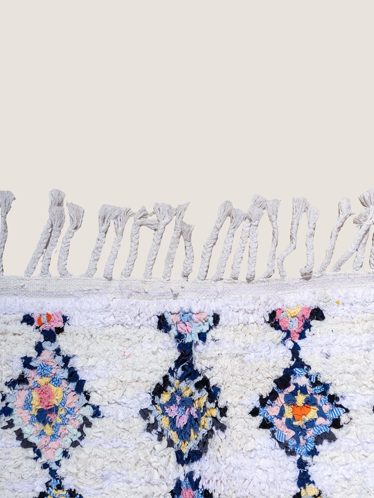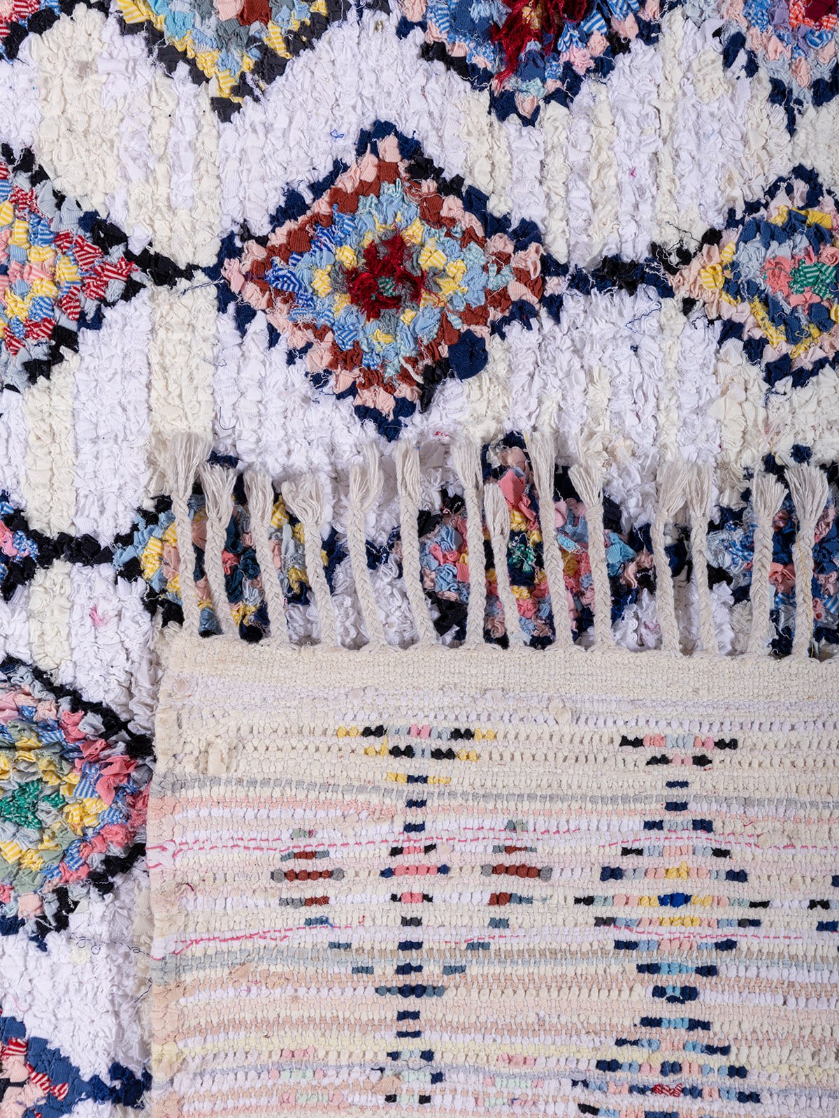 This beautiful rug features a soft geometric diamond pattern on a white base, with colorful accents. Its playful yet elegant aesthetic makes it a unique statement piece, ideal for modern, bohemian, or eclectic interiors.