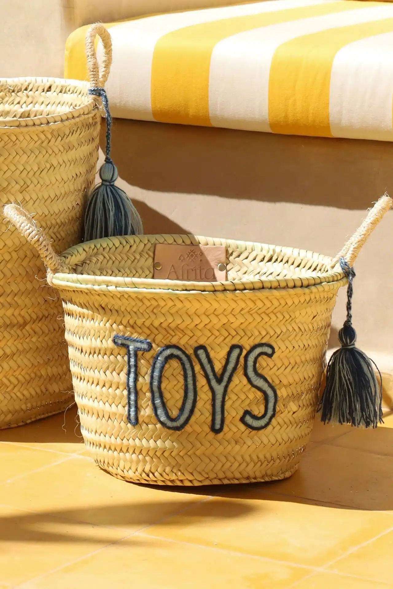 This charming handwoven basket is made from natural palm leaves, featuring playful, blue “TOYS” embroidery. With sturdy handles and a spacious interior, it’s perfect for storing toys, blankets, or everyday essentials while adding a fun and stylish touch to any space. The decorative tassel adds an extra element of charm, making it a great addition to kids’ rooms or play areas.