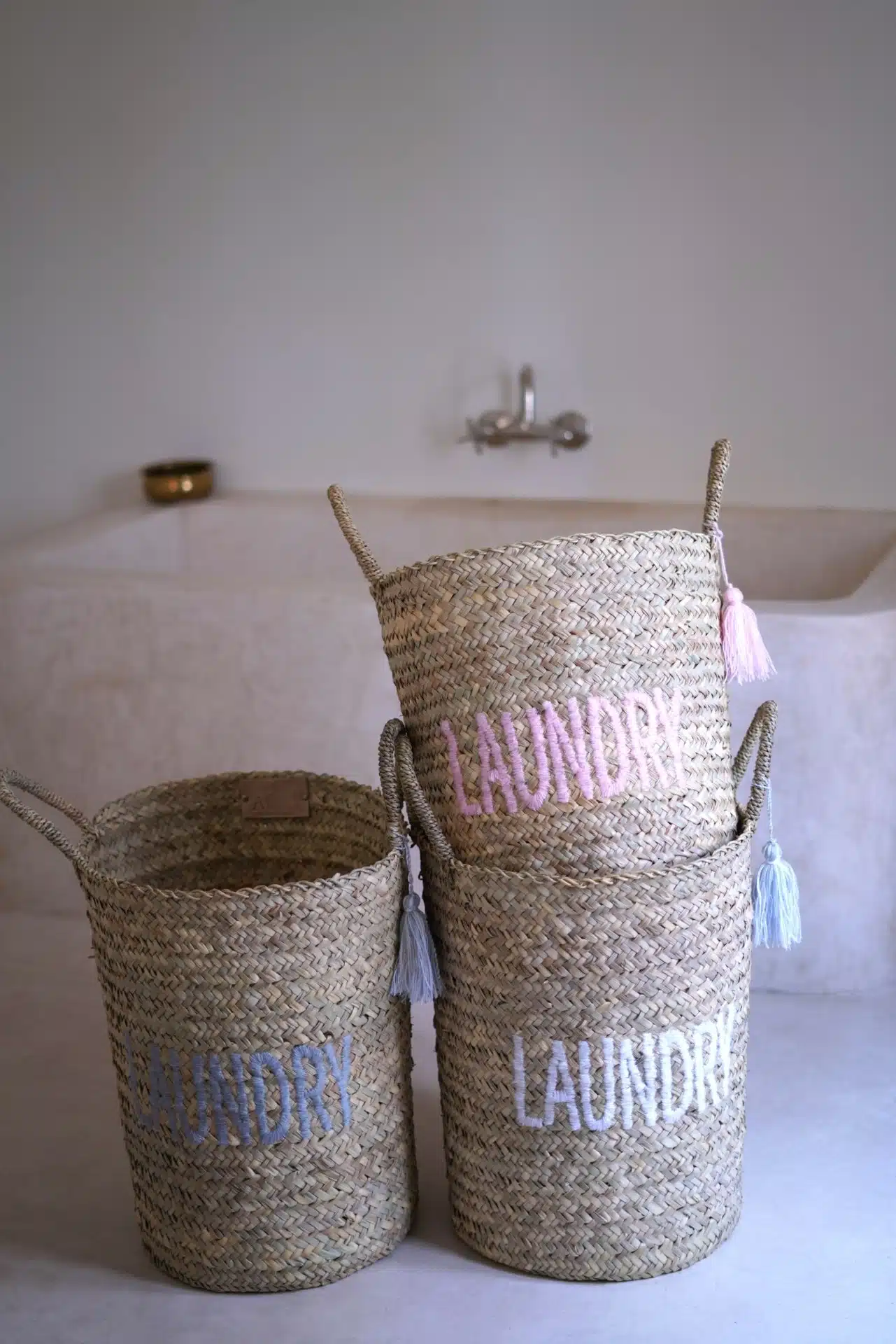 Handwoven laundry baskets made from natural palm leaves, featuring delicate pastel embroidery and playful tassels. Perfect for adding charm and practicality to your home organization.