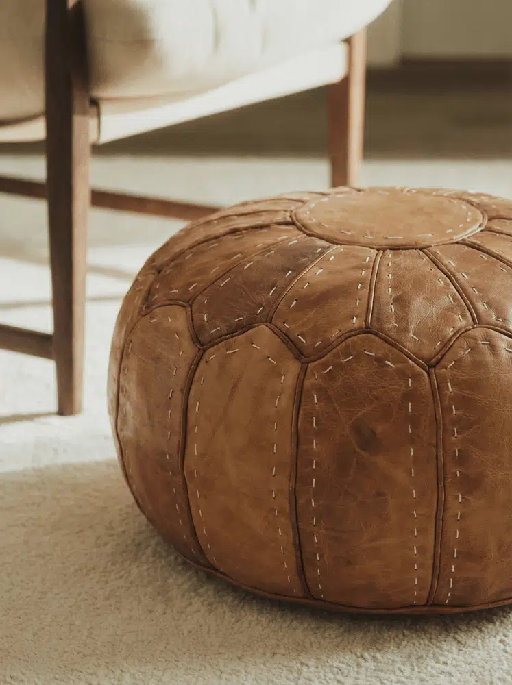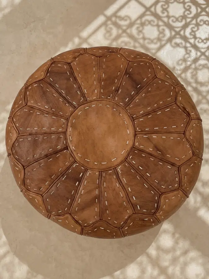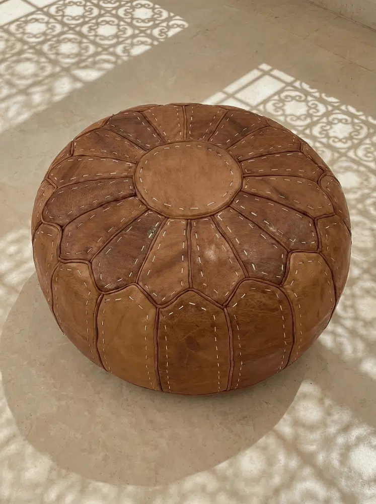 This minimalist Moroccan leather ottoman is handmade from high-quality genuine leather, featuring subtle stitched detailing for a natural, earthy look. Timeless in design and incredibly versatile, ideal as a footrest, low seat, or bohemian accent piece.