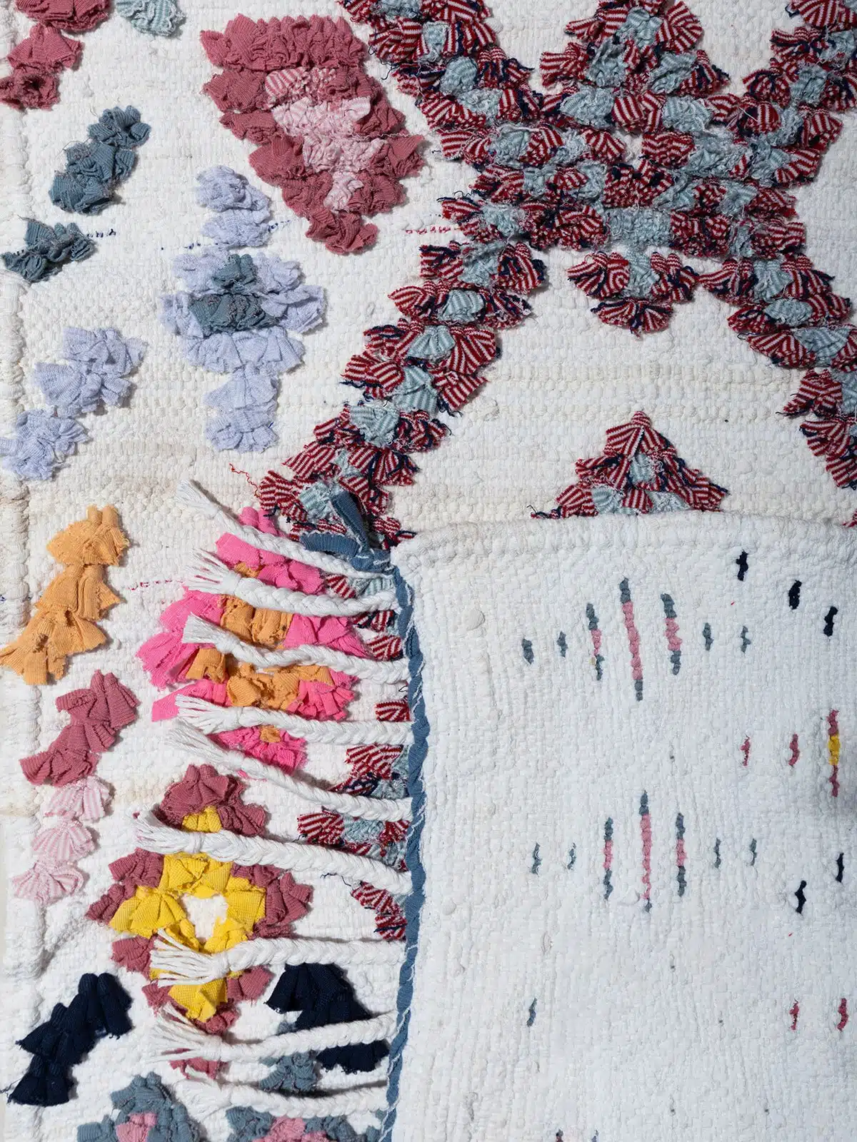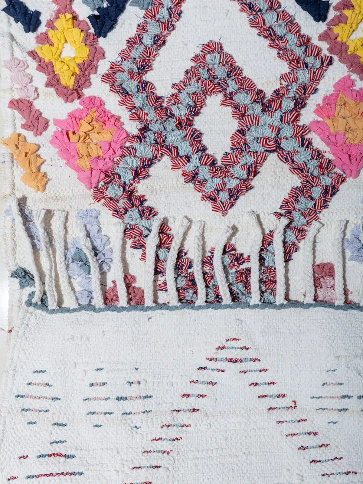 A stunning, one-of-a-kind Boucherouite rug artistically hand-woven from recycled textiles. This piece features a playful display of colorful diamond motifs in shades of pink, yellow, blue, and grey against a cream base. A unique home decor gem that adds texture, personality, and a pop of color to any space.