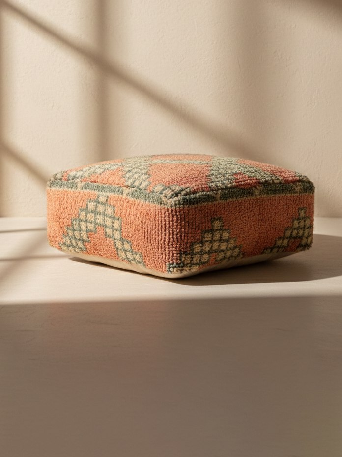 one-of-a-kind vintage Moroccan pouf is a true piece of functional art, handcrafted from an authentic wool rug. Its rich, warm palette of peach, green, and beige, combined with a traditional geometric pattern, brings instant character and a touch of bohemian luxury to any space. As a genuine vintage item, each pouf tells its own story, making it a unique addition to your home that cannot be replicated. Perfect as stylish floor seating or a distinctive accent piece.