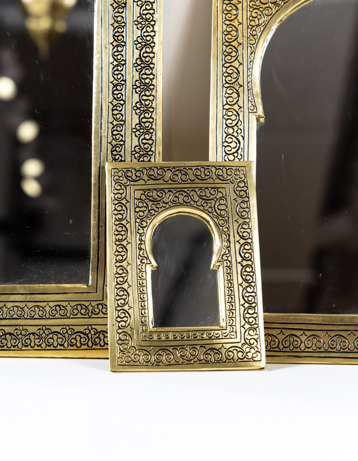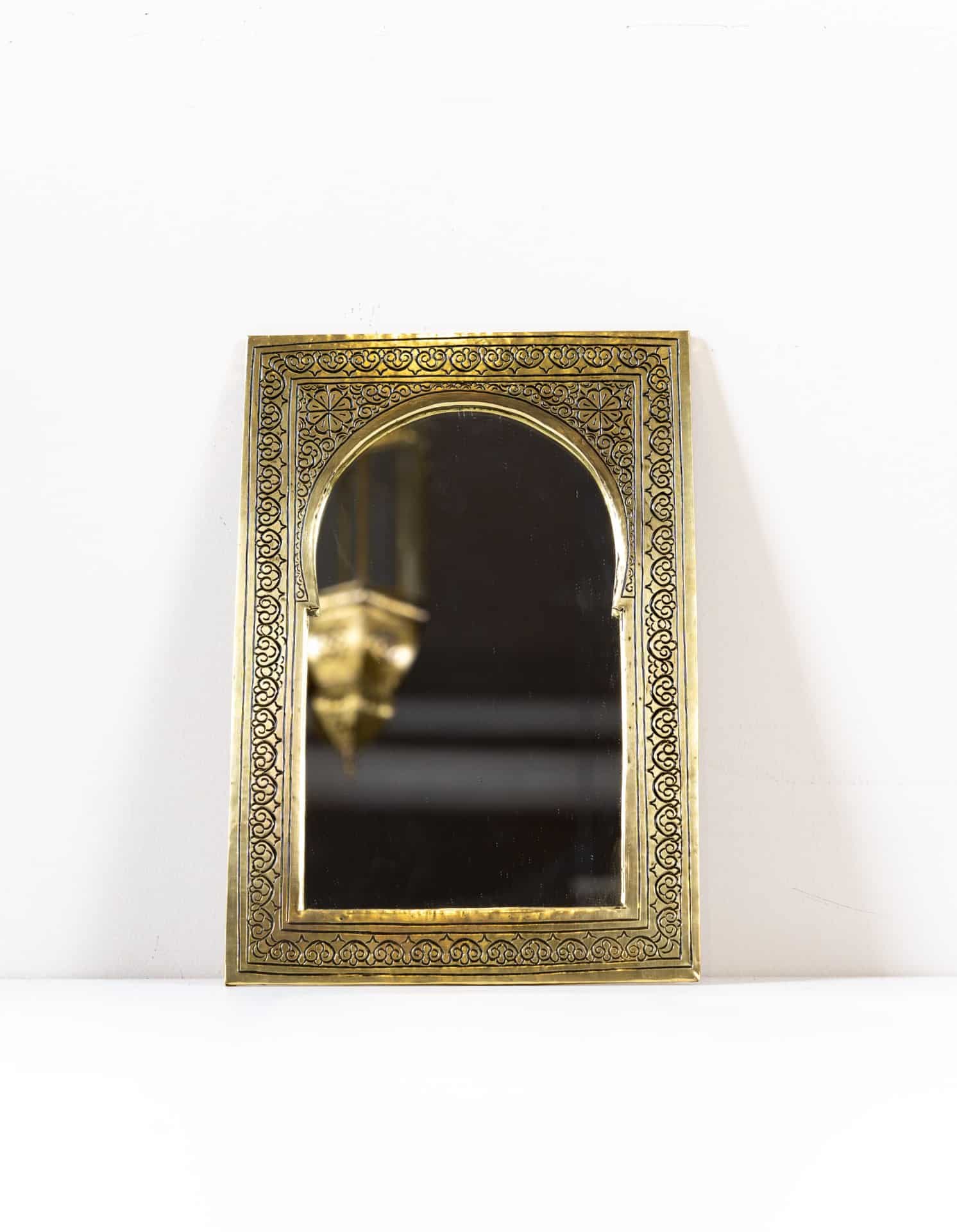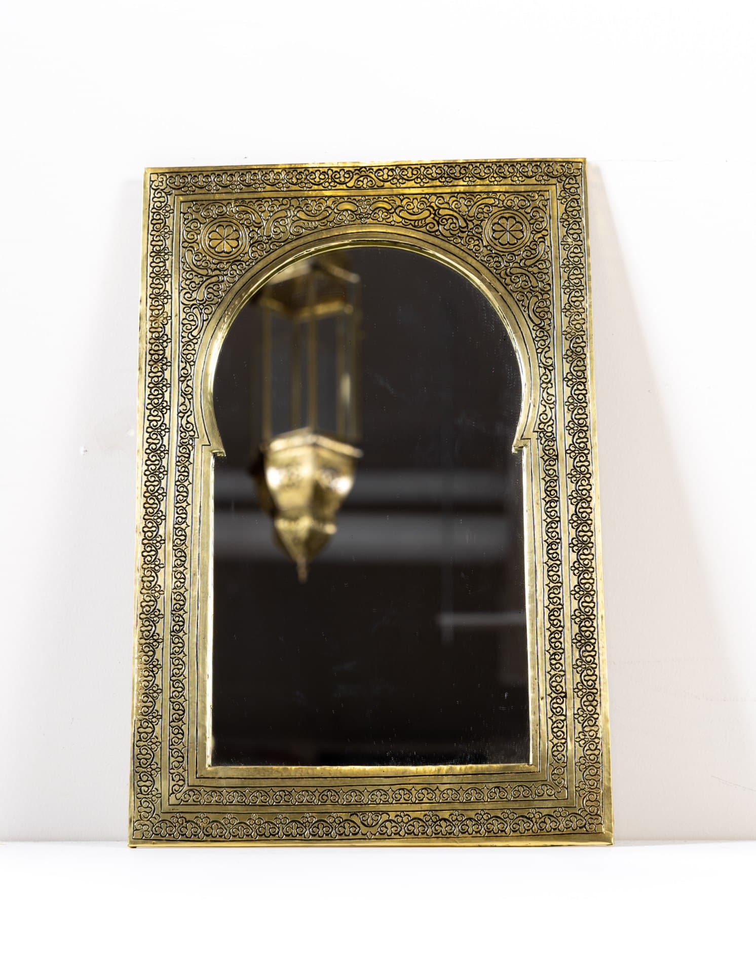 A stunning wall mirror crafted from high-quality copper, created using traditional techniques by skilled Moroccan artisans. The frame is adorned with delicate copper embossing and intricate geometric patterns, hand-engraved to give each piece a unique, one-of-a-kind character.