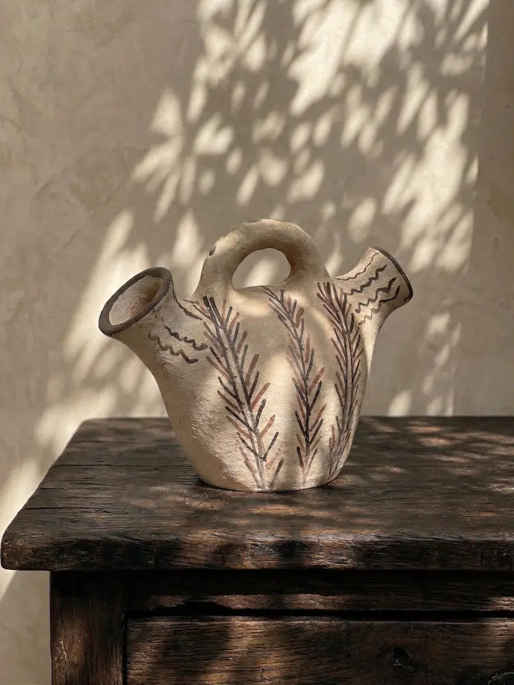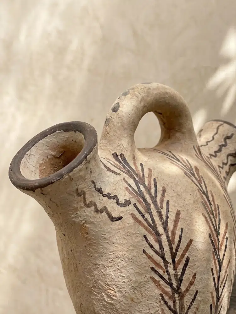 Traditional Moroccan jug handcrafted in the Rif mountains. Made from natural clay and decorated with hand-painted Berber motifs. A rustic and authentic piece, perfect as a decorative accent.