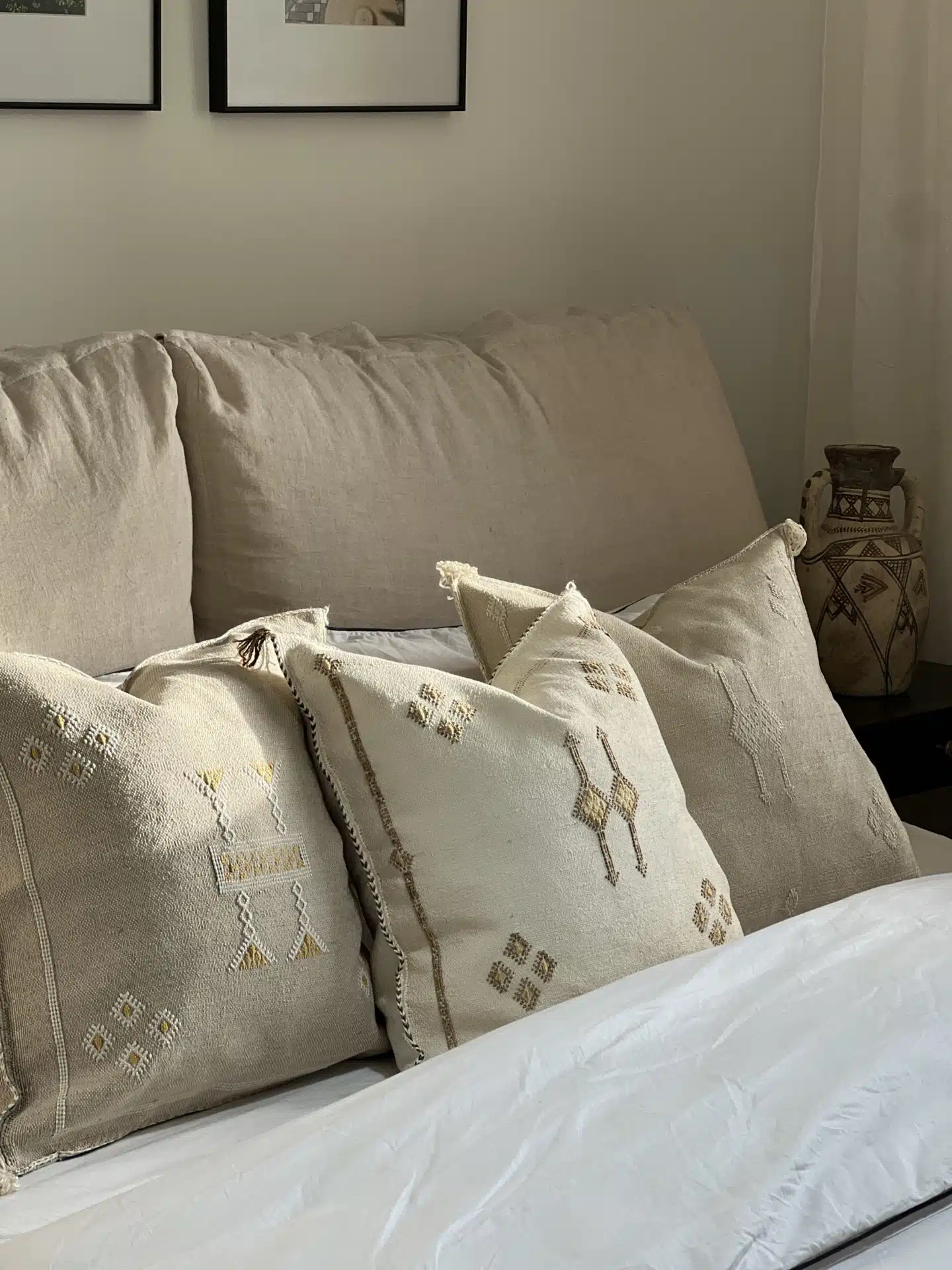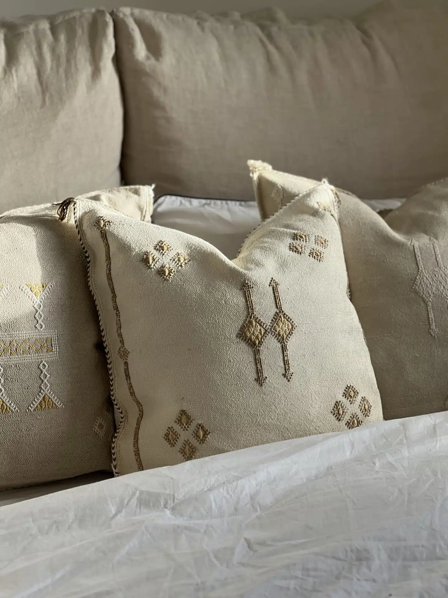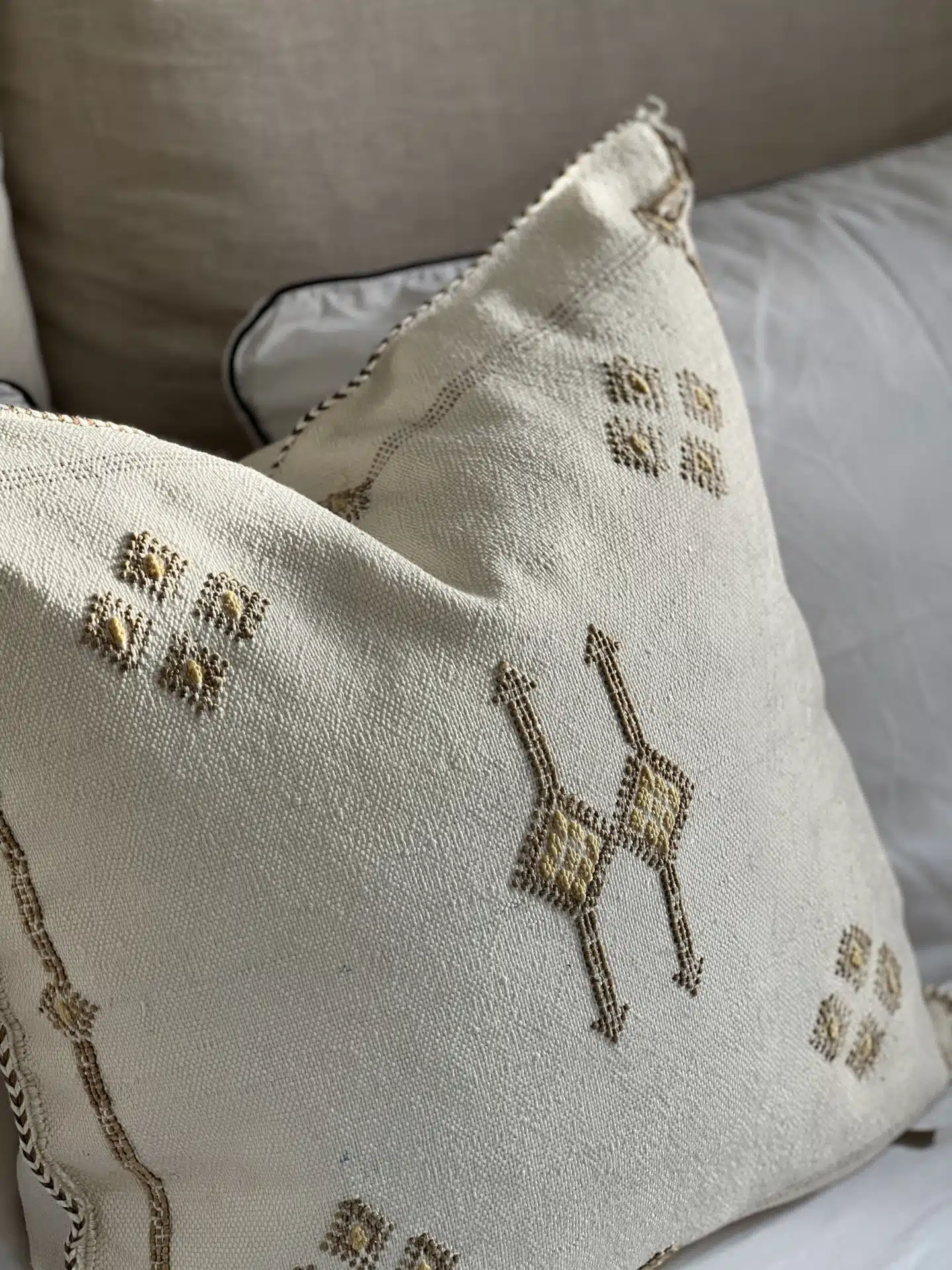 This handcrafted Moroccan pillow is made from vintage cactus silk and dyed in a white hue with traditional Amazigh motifs. Each piece is one-of-a-kind, adding a delicate, earthy charm to your living space, perfect for layering on sofas, beds, or reading nooks.