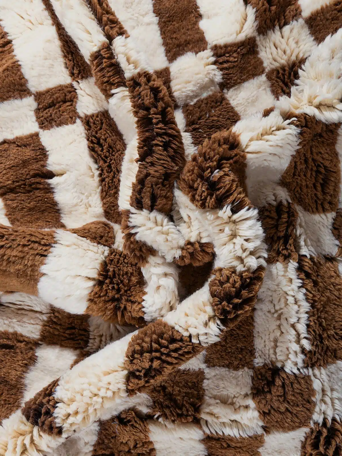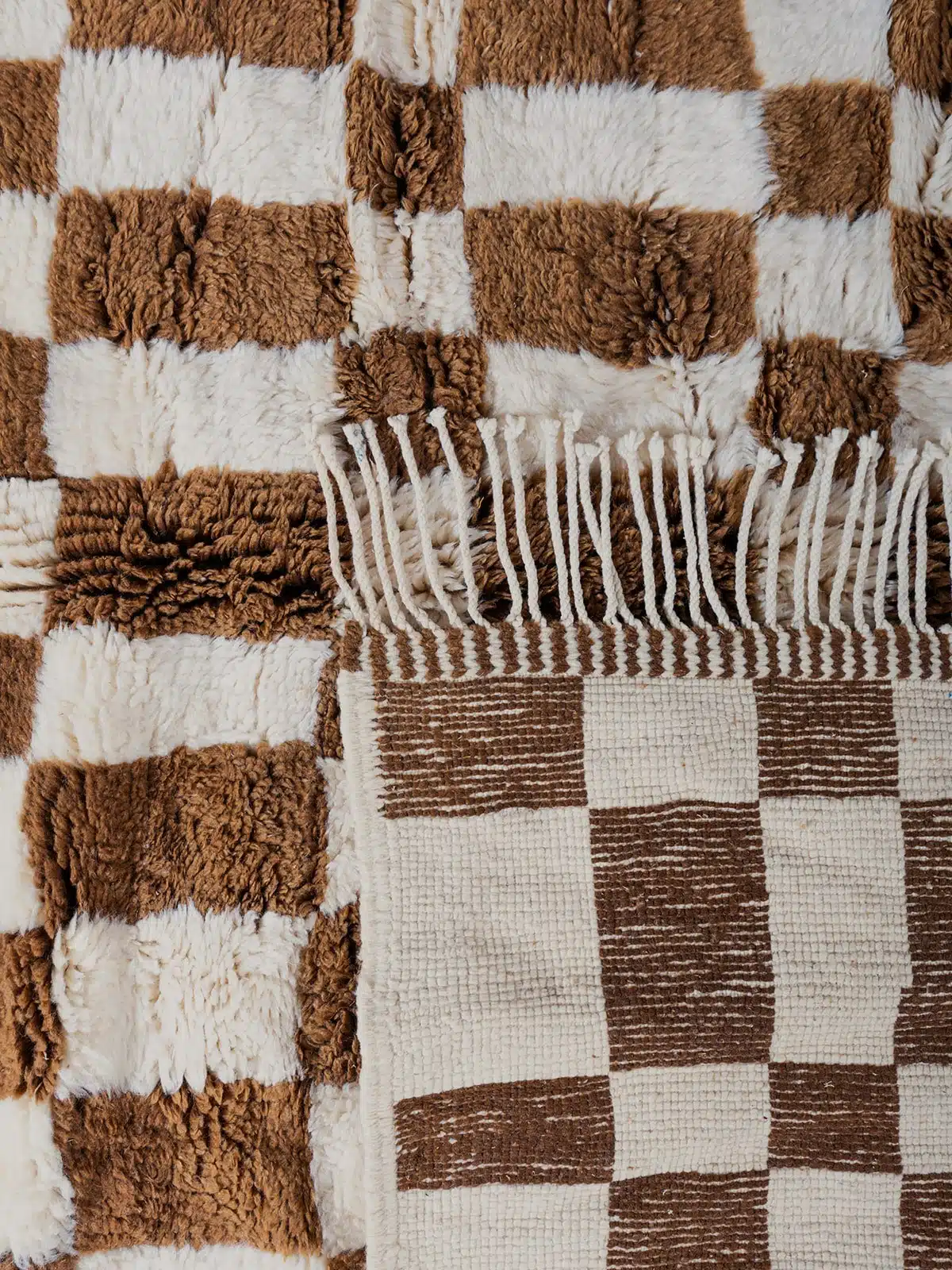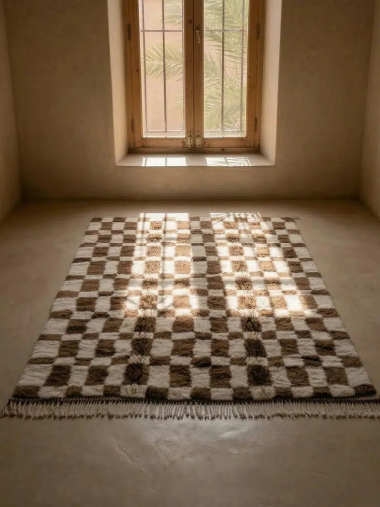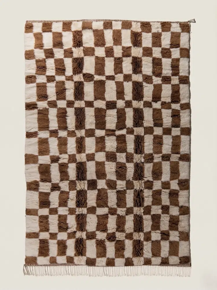 An authentic Beni M’rirt rug, handcrafted from 100% premium, high-density sheep’s wool, offering an exceptionally soft and plush texture. The modern checkerboard pattern, combined with natural earthy tones, creates a perfect balance between tribal tradition and contemporary chic. A timeless piece that brings warmth and sophisticated character to any room.