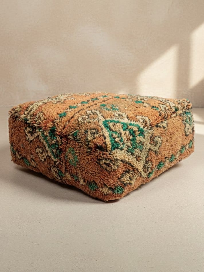 one-of-a-kind vintage Moroccan pouf is a true piece of functional art, handcrafted from an authentic wool rug. Its rich, warm palette of terracotta, green, and beige, combined with a traditional geometric pattern, brings instant character and a touch of bohemian luxury to any space. As a genuine vintage item, each pouf tells its own story, making it a unique addition to your home that cannot be replicated. Perfect as stylish floor seating or a distinctive accent piece.