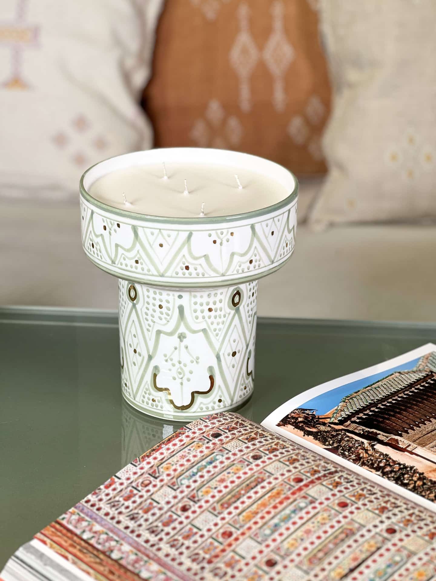 This beautiful candle was developed in the city of Grasse, France. the candle wax is soy-based and therefore durable over time, the cotton wicks ensure good combustion and disperse the fragrance in the room. The delicate fragrance will bring a real sense of Moroccan gardens to your home. It features 12-karat gold ornaments that create a unique and prestigious design. When the candle is finished, clean the jug and use it as a beautiful serving bowl.