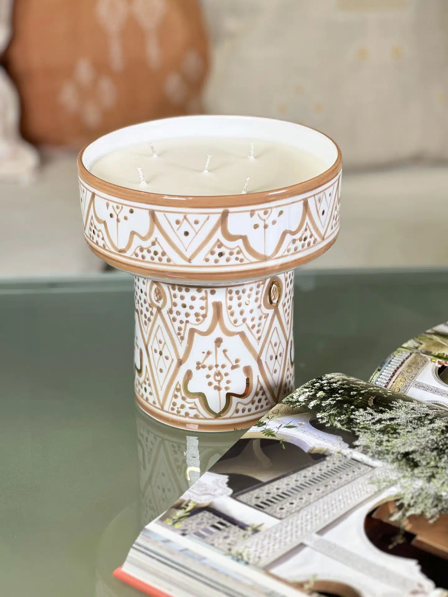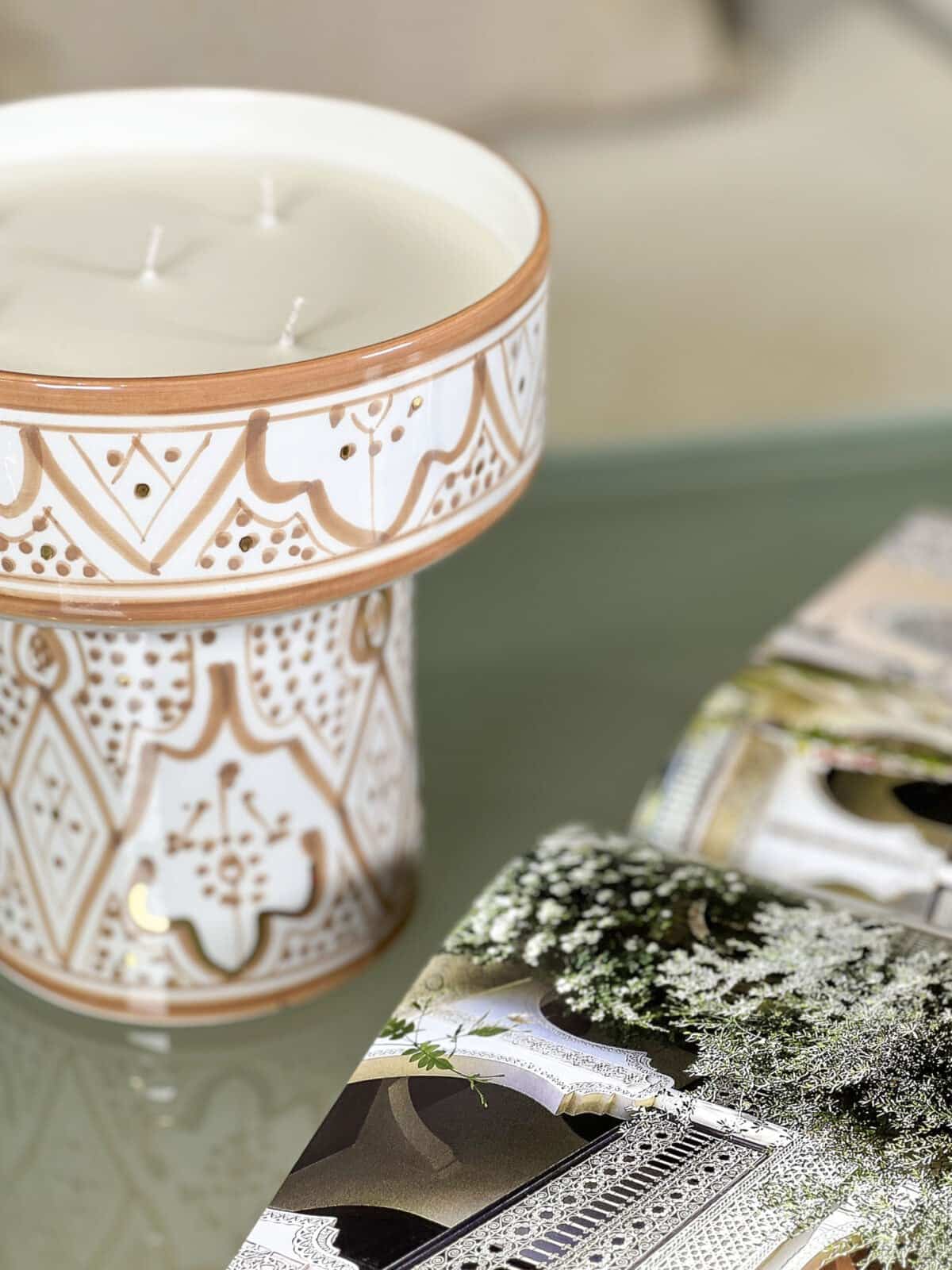 This beautiful candle was developed in the city of Grasse, France. the candle wax is soy-based and therefore durable over time, the cotton wicks ensure good combustion and disperse the fragrance in the room. The delicate fragrance will bring a real sense of Moroccan gardens to your home. It features 12-karat gold ornaments that create a unique and prestigious design. When the candle is finished, clean the jug and use it as a beautiful serving bowl.