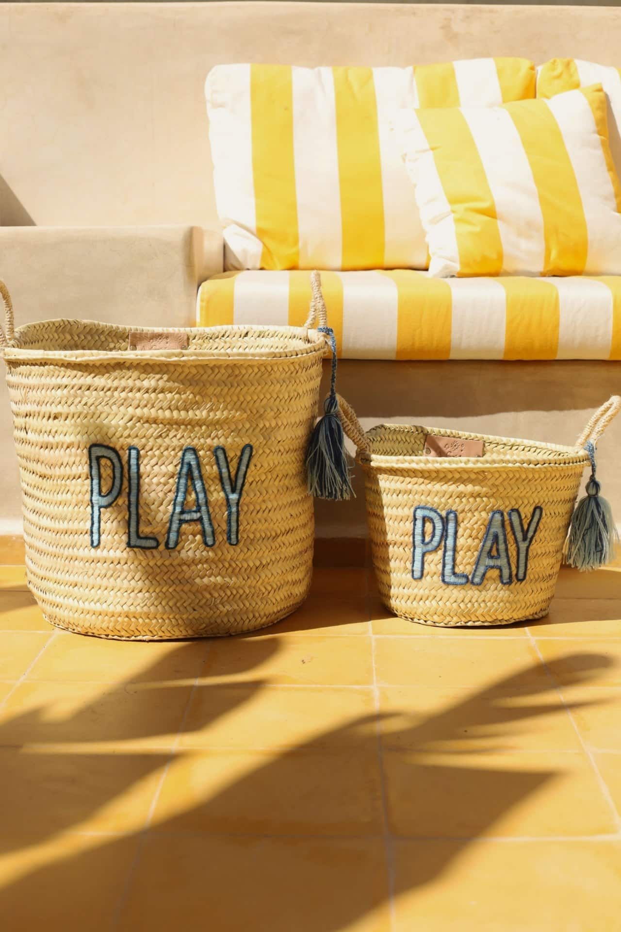 This charming handwoven basket is made from natural palm leaves, featuring playful, blue “PLAY” embroidery. With sturdy handles and a spacious interior, it’s perfect for storing toys, blankets, or everyday essentials while adding a fun and stylish touch to any space. The decorative tassel adds an extra element of charm, making it a great addition to kids’ rooms or play areas.