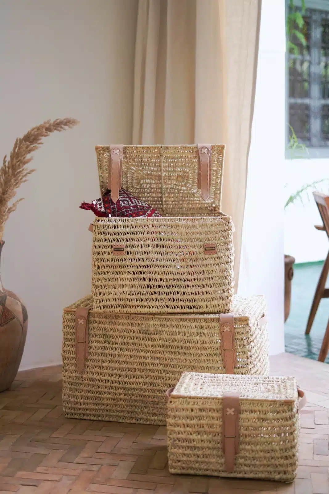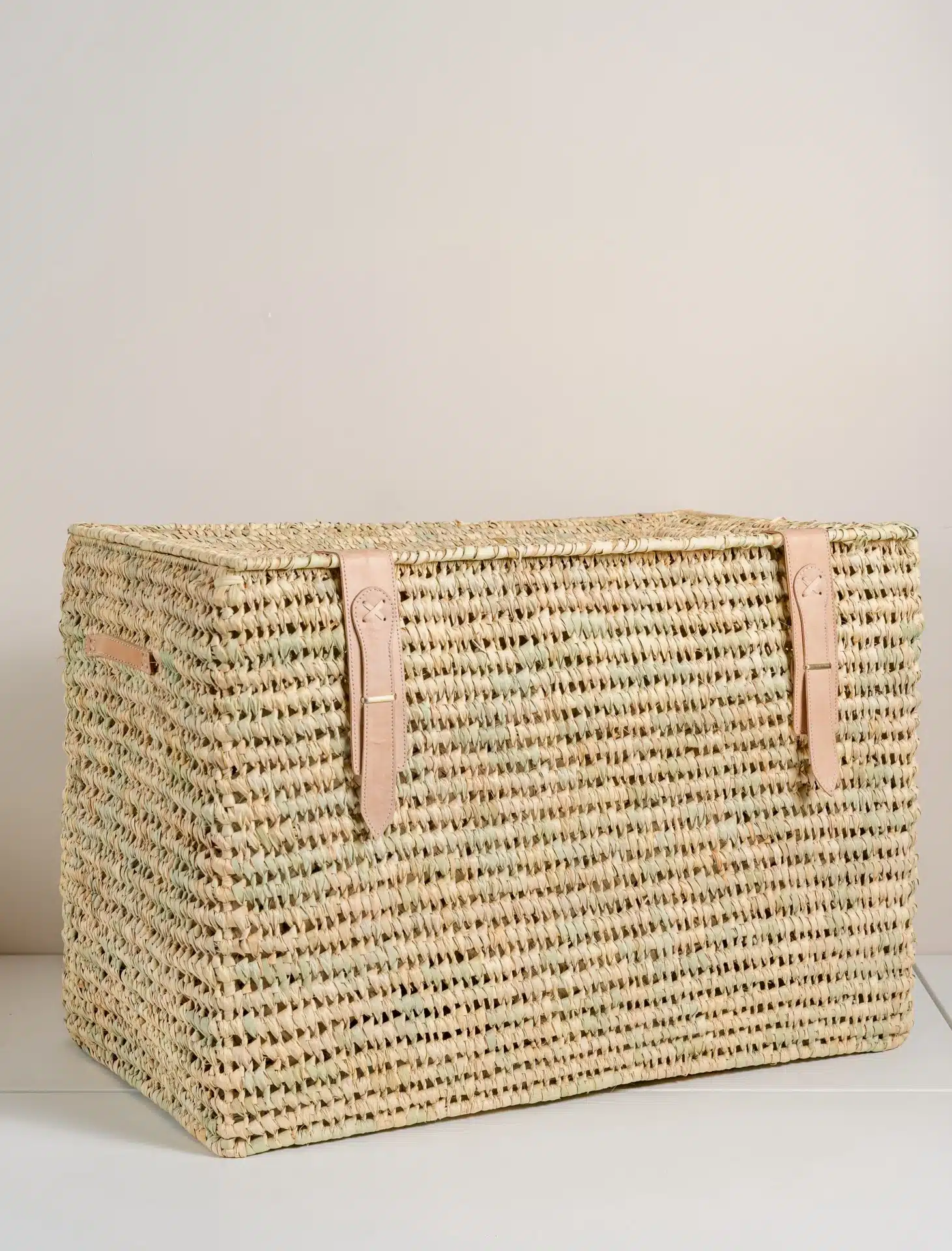 Handwoven storage trunk made from natural palm leaves with leather strap closures. A perfect blend of rustic charm and functionality, ideal for storing blankets, toys, or household essentials. Adds a natural touch to any space.
