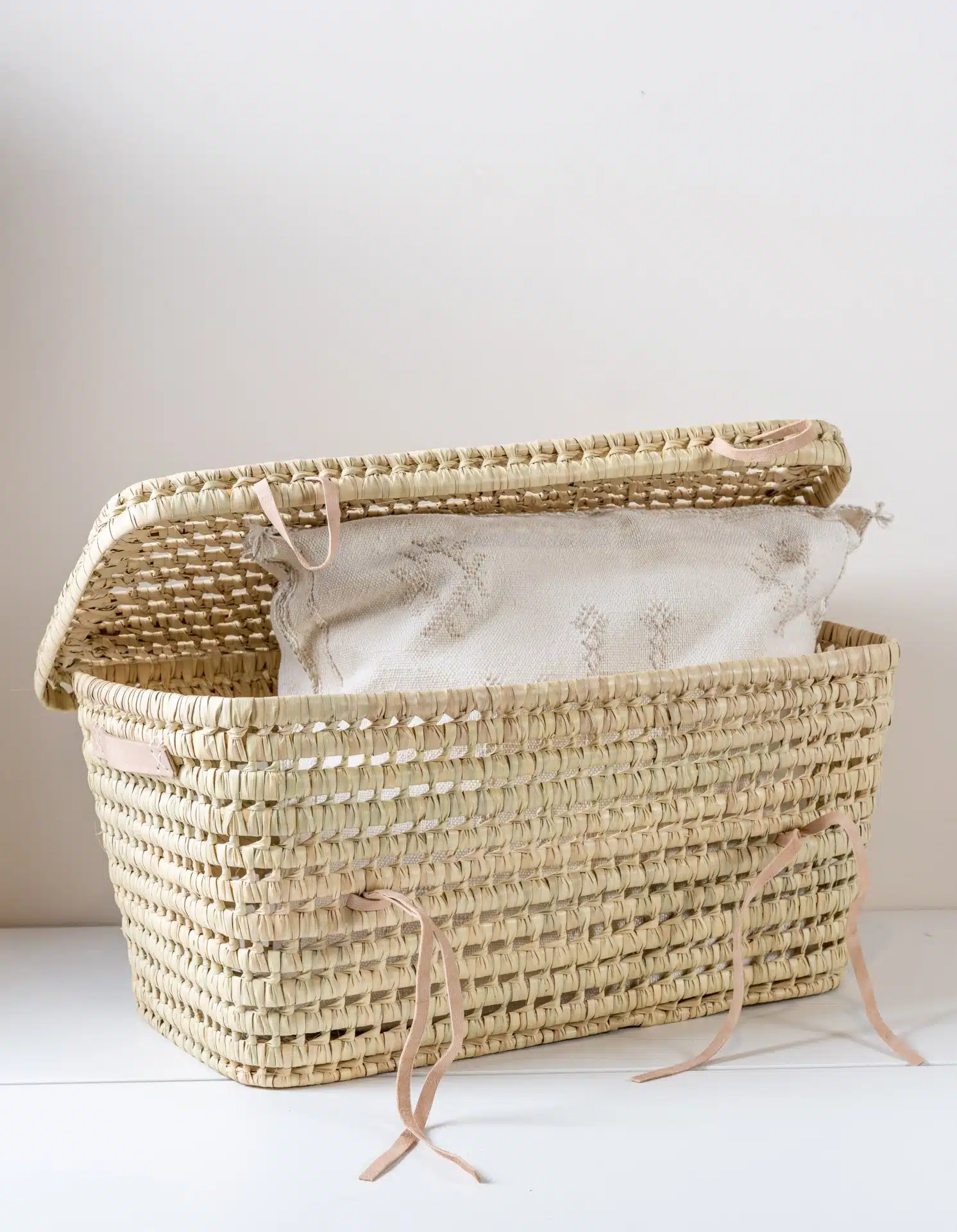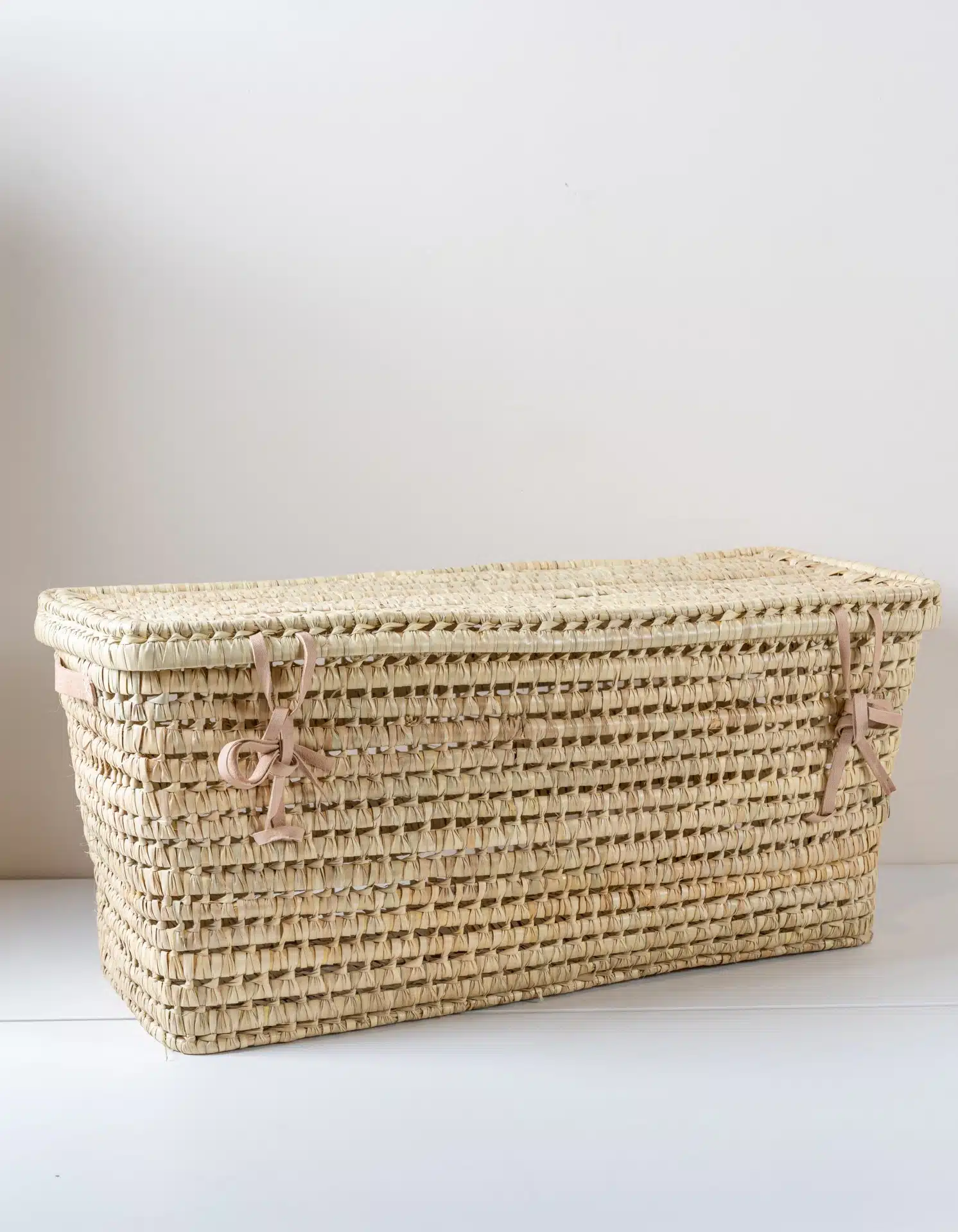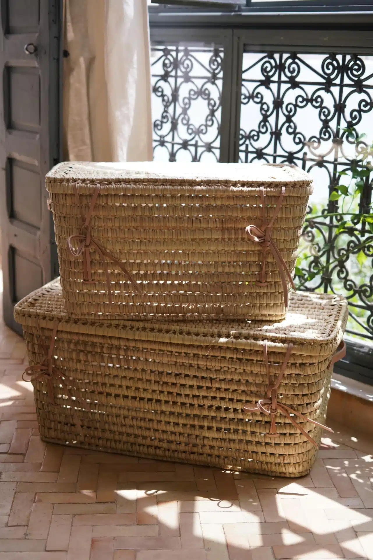 Enhance your home with this beautifully handcrafted woven storage trunk. Made from natural fibers, this elegant and sturdy basket is perfect for organizing blankets, toys, or household essentials. Featuring a natural leather straps for secure closure, it adds a touch of rustic charm to any space.