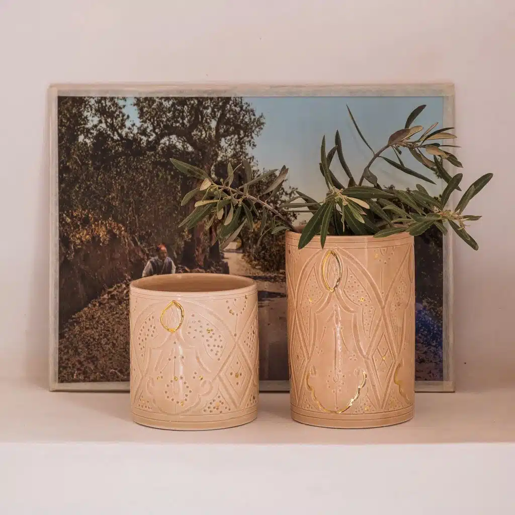 Handcrafted in Morocco, this exquisite ceramic container embodies traditional craftsmanship and timeless elegance. Adorned with intricate hand-carved motifs inspired by Moroccan architecture, it serves as a versatile piece, perfect as a decorative accent, utensil holder, or planter. A true celebration of artisanal heritage, it brings warmth and authenticity to any space.