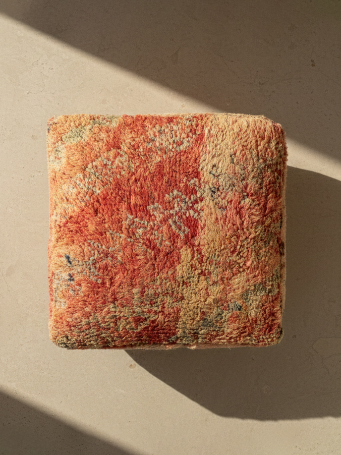 one-of-a-kind vintage Moroccan pouf is a true piece of functional art, handcrafted from an authentic wool rug. Its rich, warm palette of terracotta, rust, and green, combined with a traditional geometric pattern, brings instant character and a touch of bohemian luxury to any space. As a genuine vintage item, each pouf tells its own story, making it a unique addition to your home that cannot be replicated. Perfect as stylish floor seating or a distinctive accent piece.