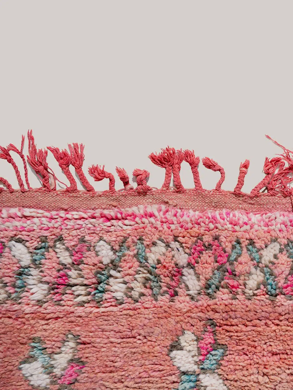 A traditional Moroccan rug, handwoven from natural wool. The combination of peach, green, and cream tones with intricate geometric patterns creates a unique and warm look. This piece brings a touch of bohemian elegance to any space and tells a story of traditional craftsmanship.