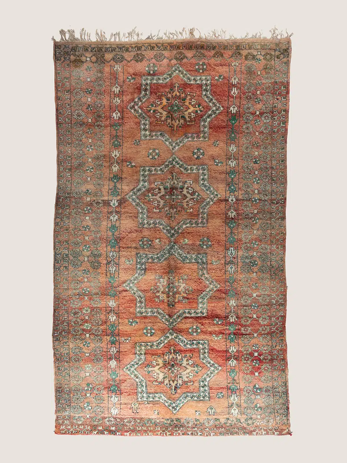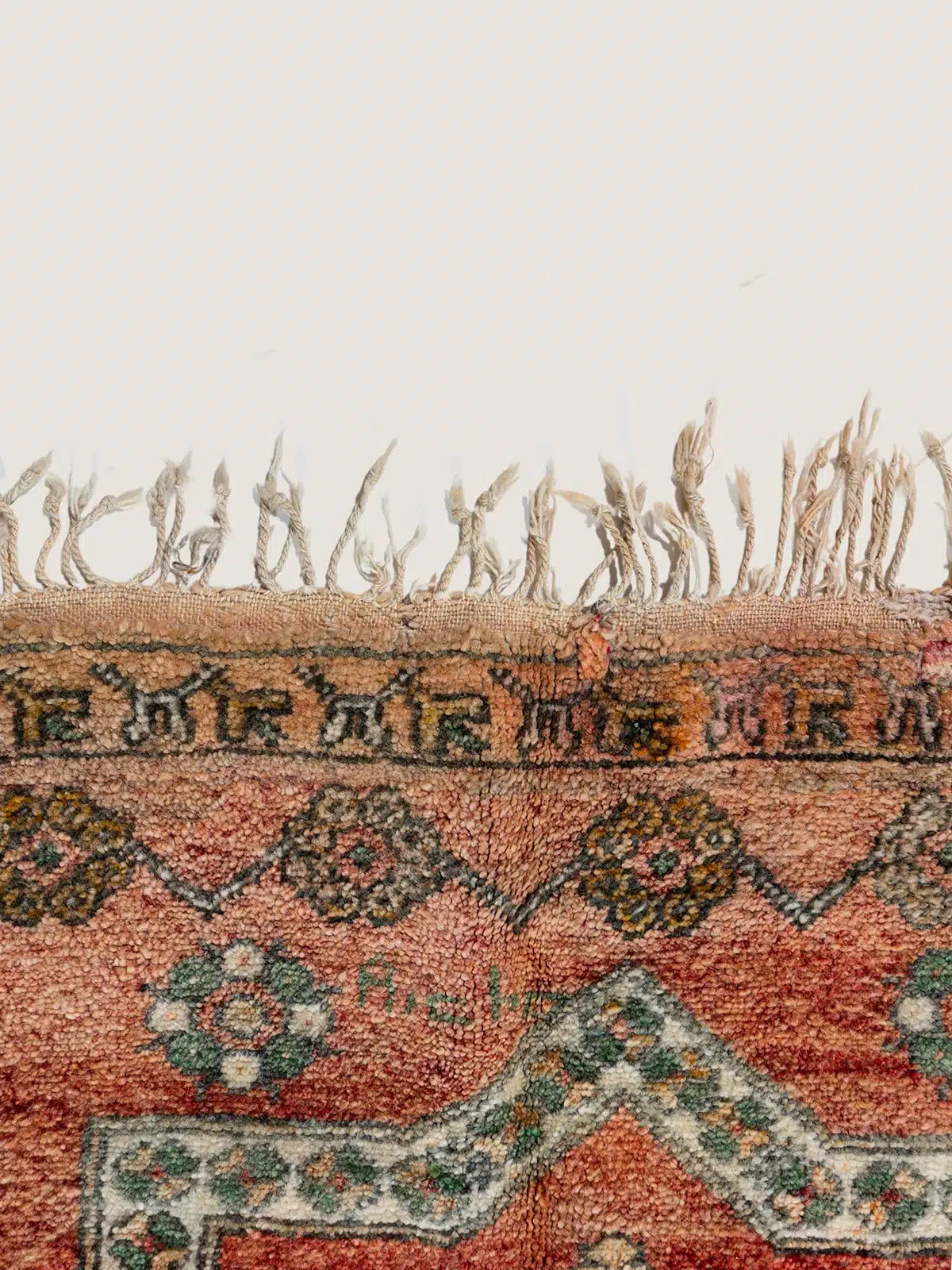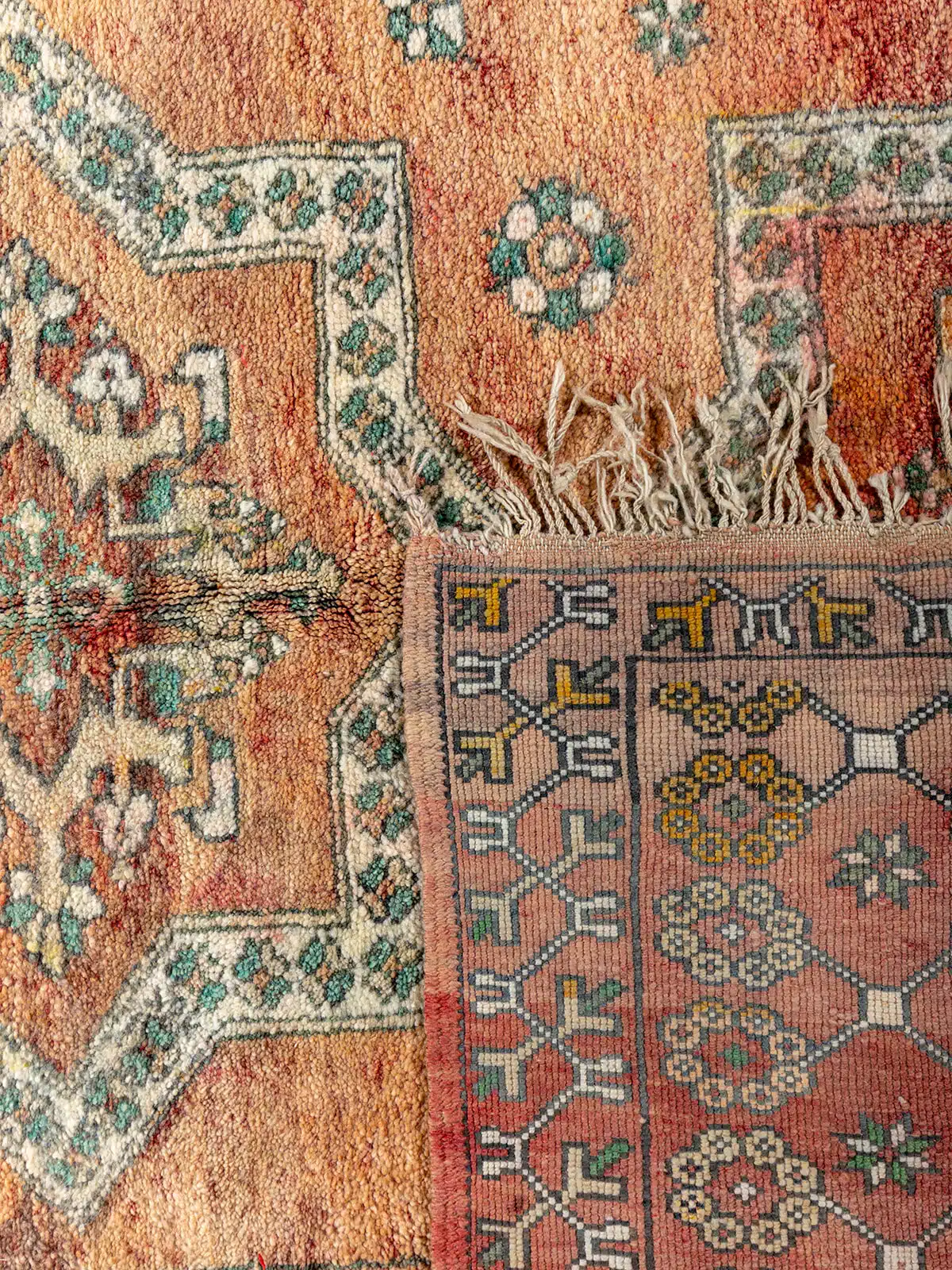 This is a beautiful vintage Moroccan rug, handwoven by Berber artisans using natural wool and vibrant dyes. The abstract Berber symbols woven throughout the design add a unique, personal touch, making it both a cultural artifact and a stunning decorative piece. The soft texture and fringed edges enhance its authentic charm.