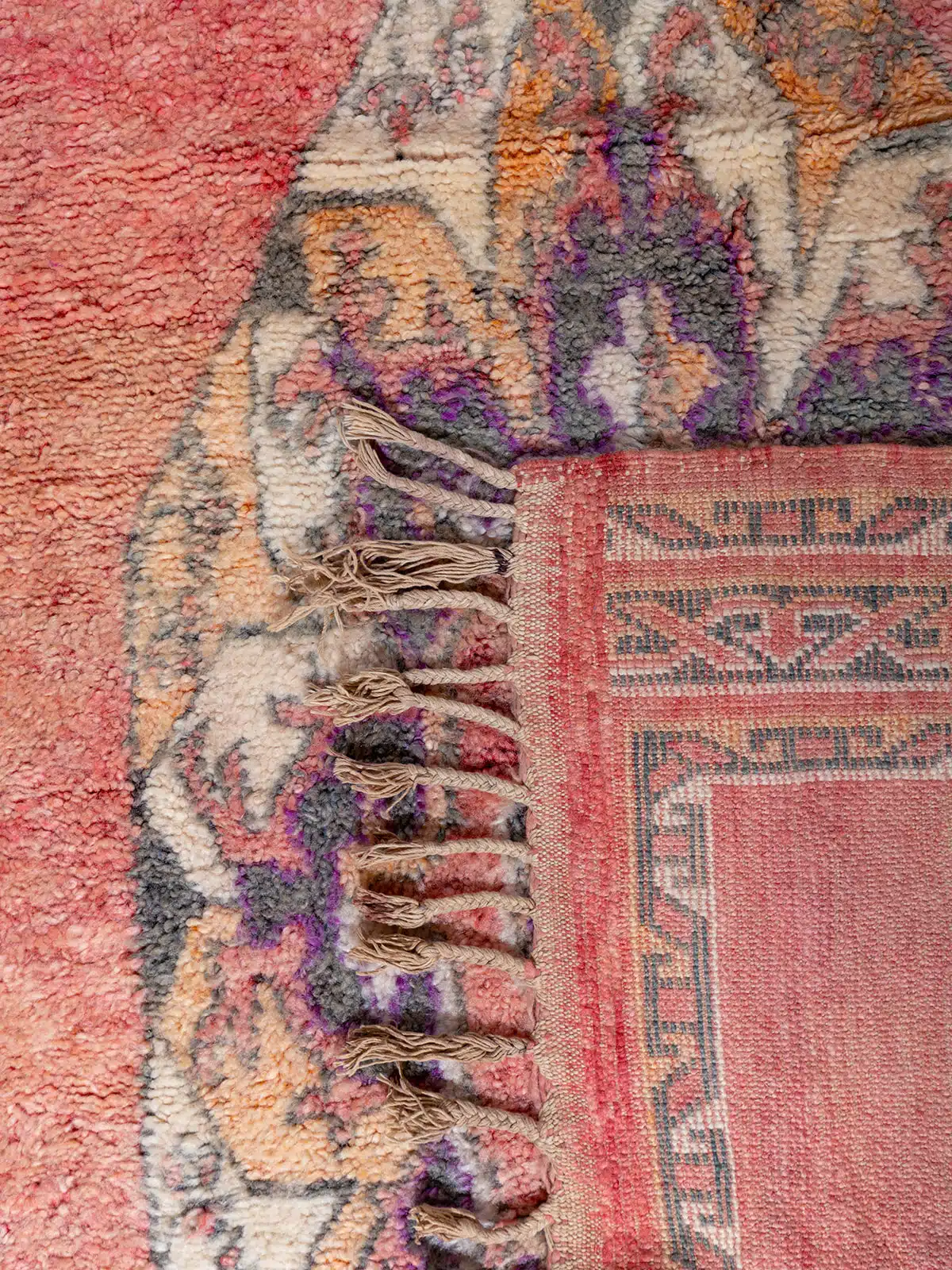 This is a stunning vintage Moroccan rug with a beautifully faded pastel color palette. The intricate diamond and geometric motifs, woven with soft tones of orange, green, and purple, give it a delicate, timeworn elegance. The subtle wear enhances its charm, making it a truly unique and authentic Berber piece.