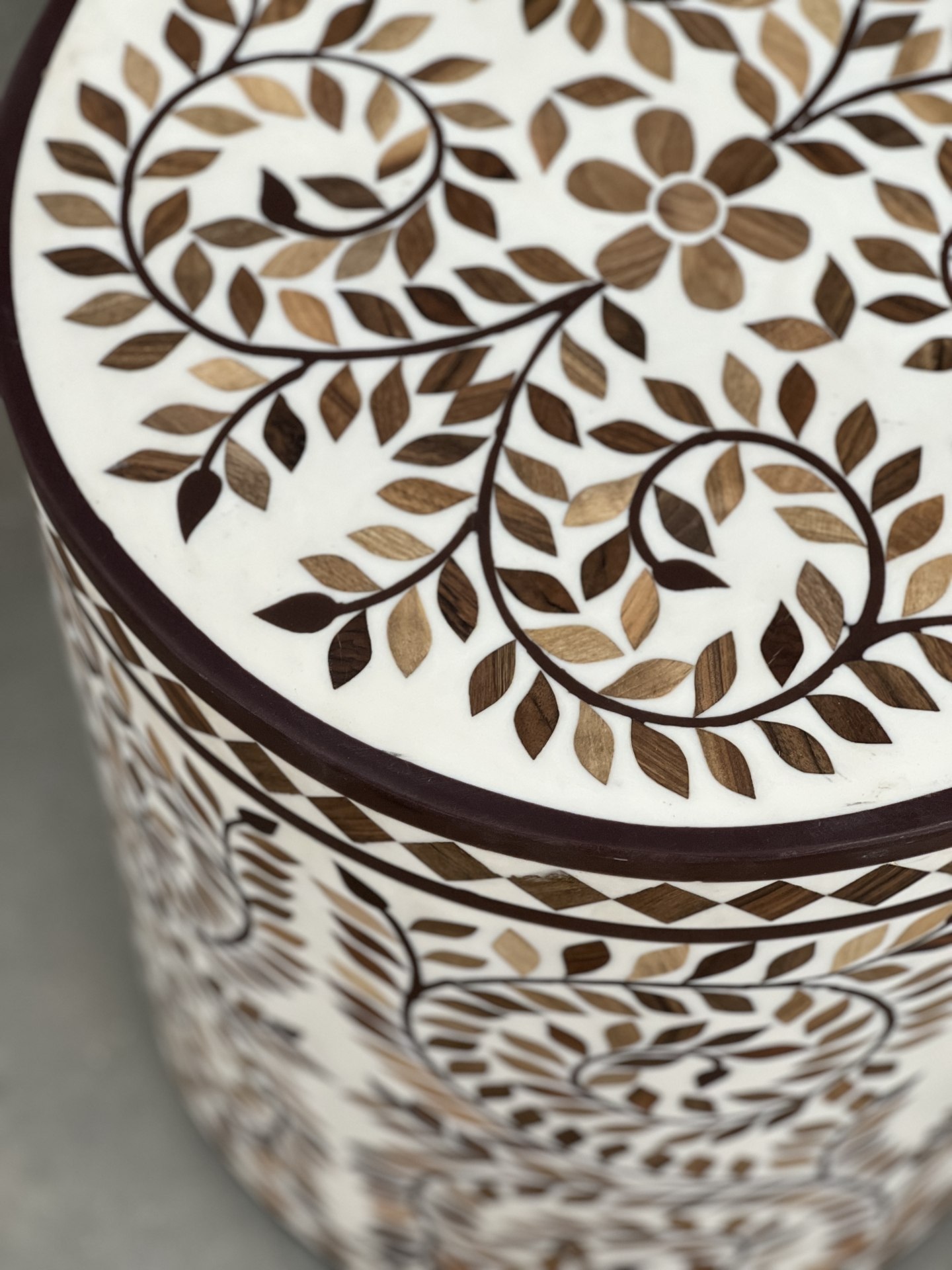 This handcrafted round wooden stool is made from solid wood and detailed with natural wood inlay in warm, earthy tones. The swirling leaf motif draws inspiration from traditional design, bringing movement, soul, and quiet elegance to any space.