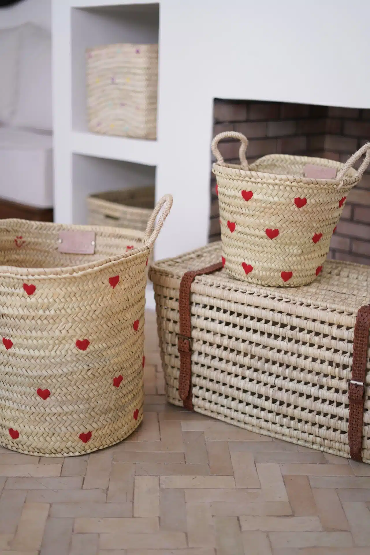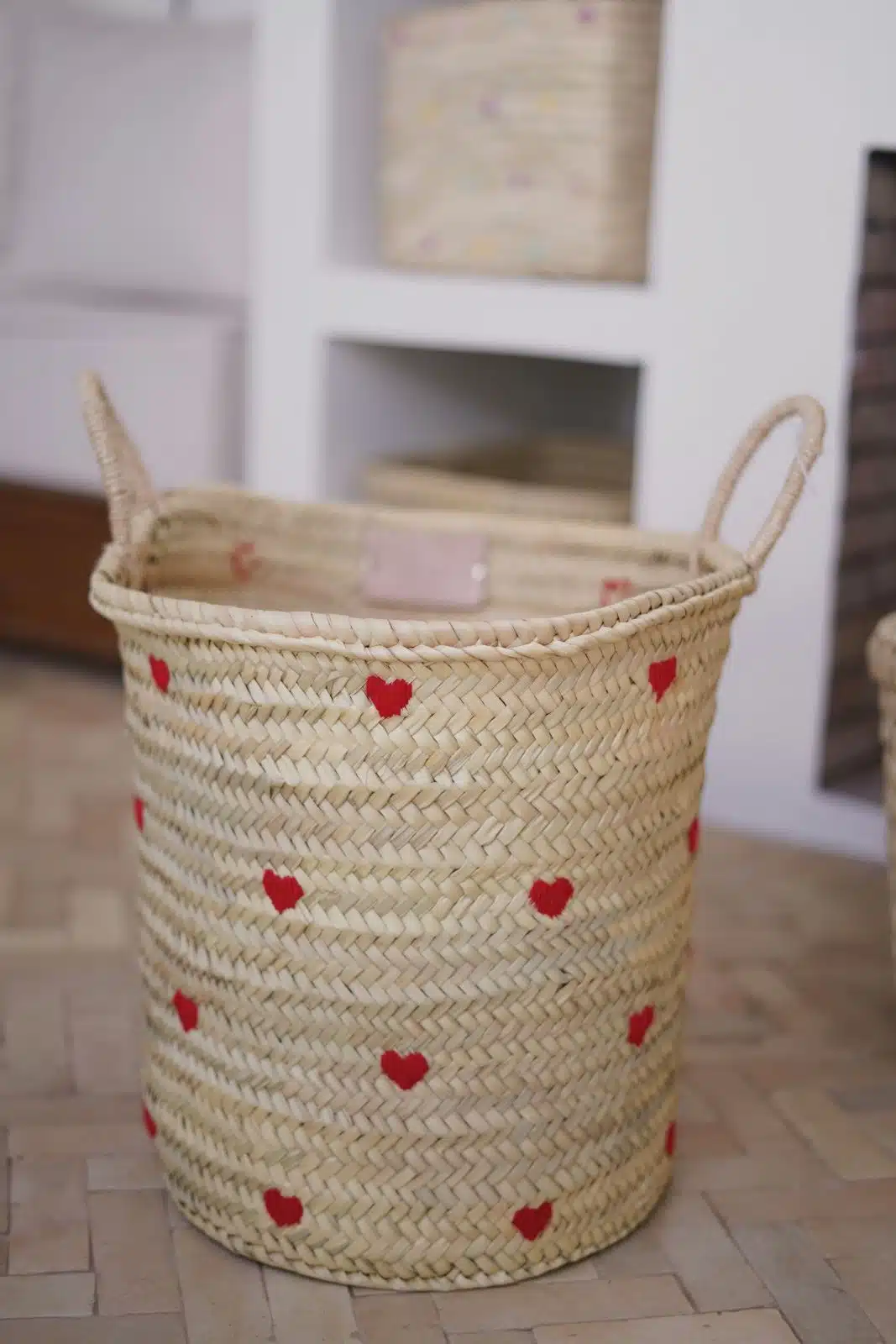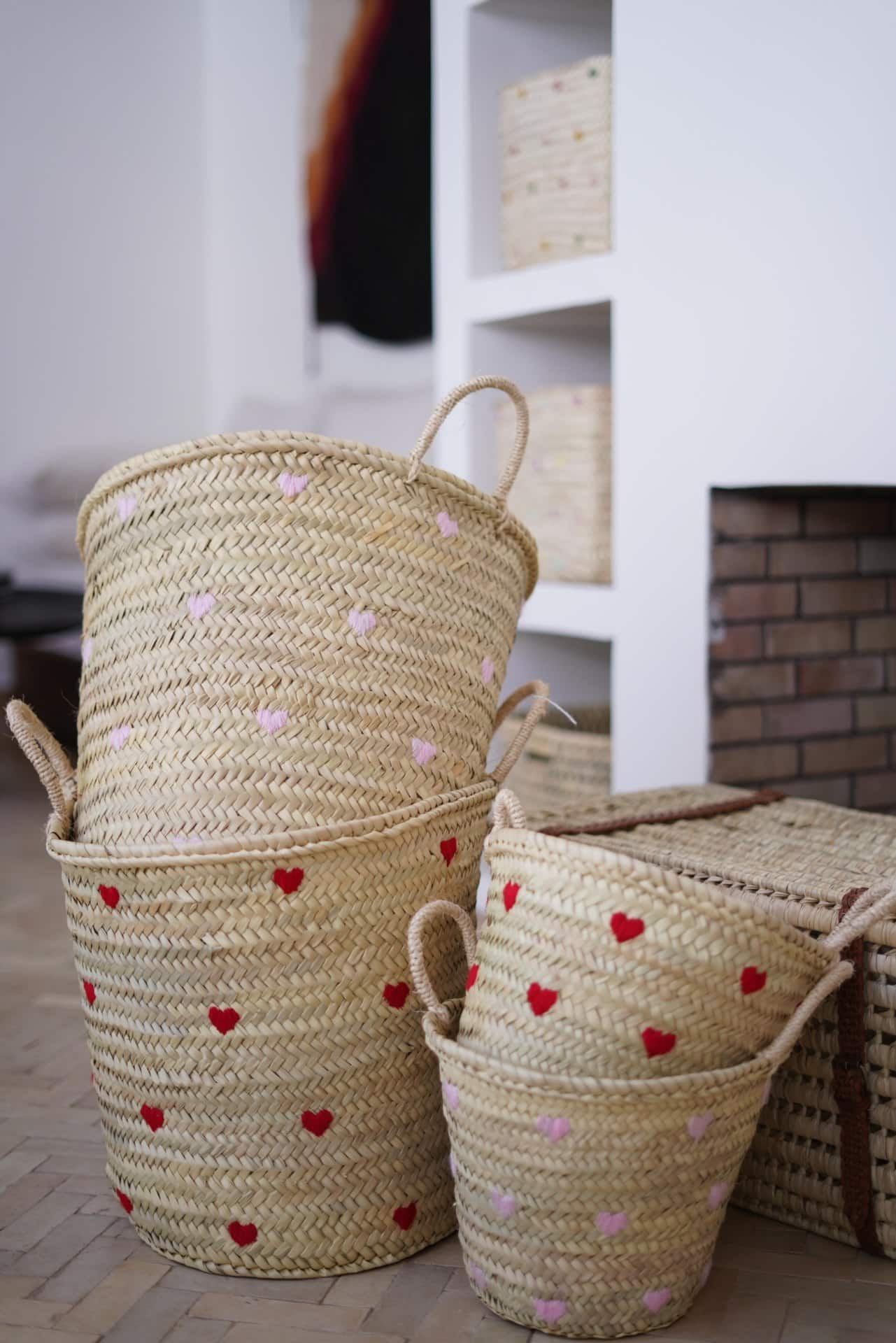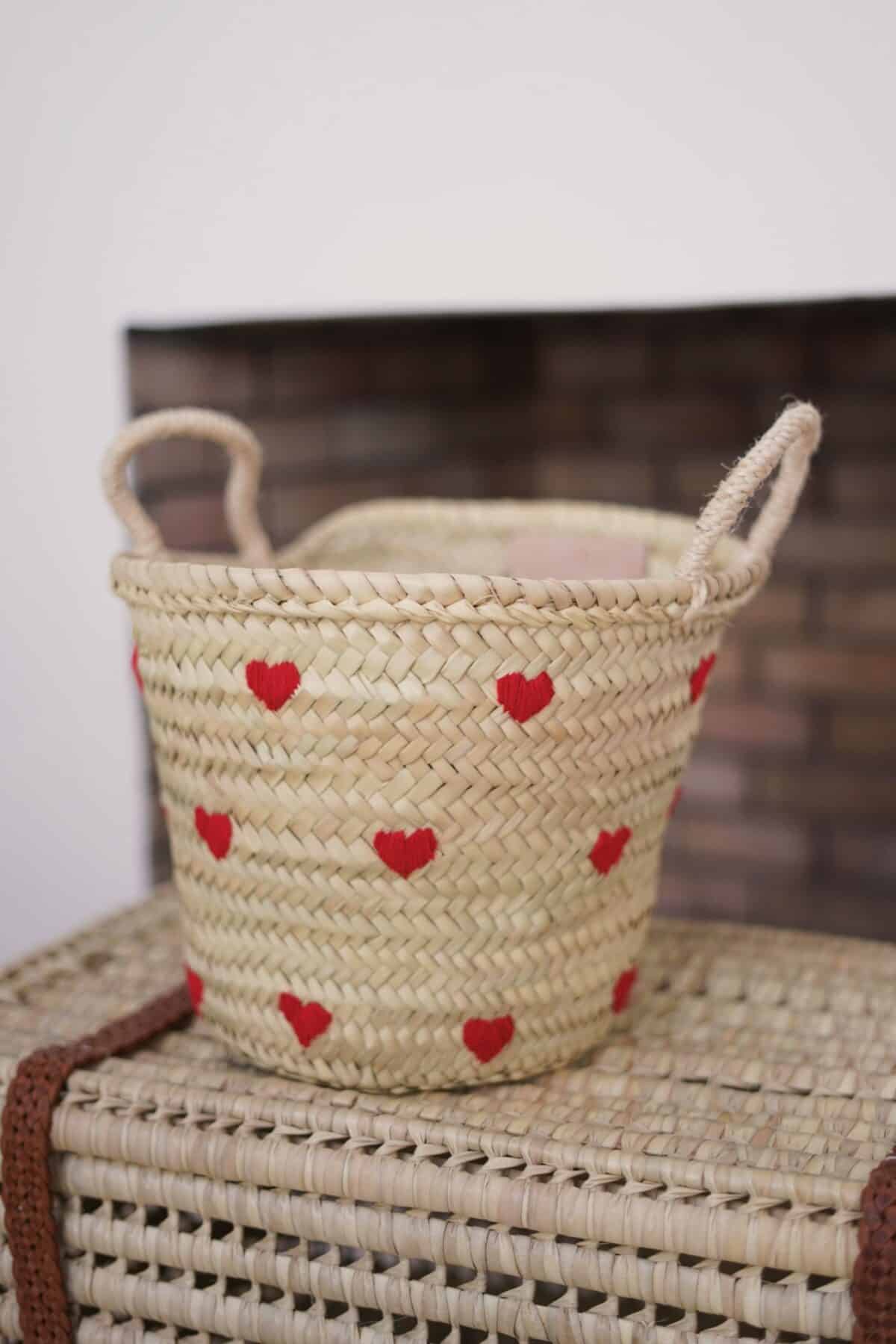 סל ארוג בעבודת יד, מעוטר ברקמת לבבות צבעונית ושובבה. עם ידיות חזקות ועיצוב מרווח, הוא אידיאלי לאחסון צעצועים, שמיכות או פריטים יומיומיים, תוך הוספת נגיעה מסוגננת ושמחה לכל חלל. תוספת מושלמת לחדרי ילדים או לפינת המשחקים.