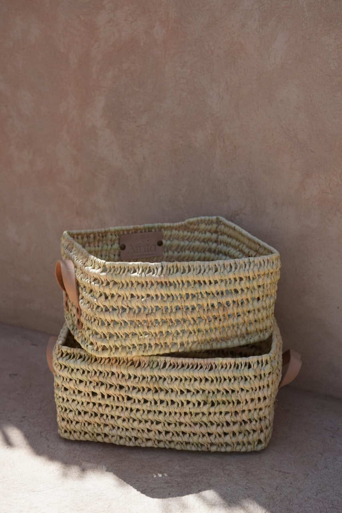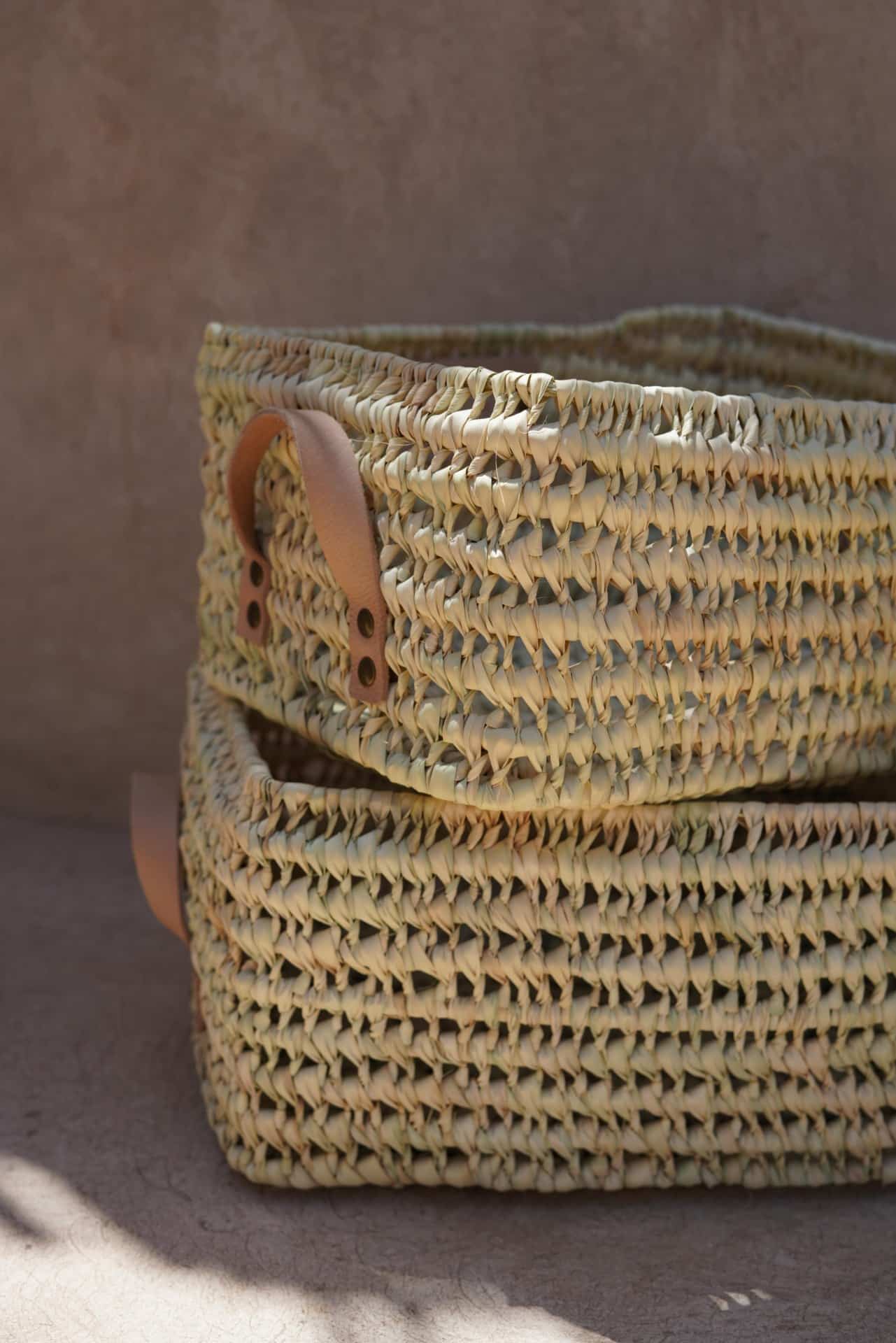 סלי אחסון מלבניים בעבודת יד מסיבים טבעיים, עם ידיות עור איכותיות. מושלמים לארגון הבית עם נגיעה כפרית טבעית.
