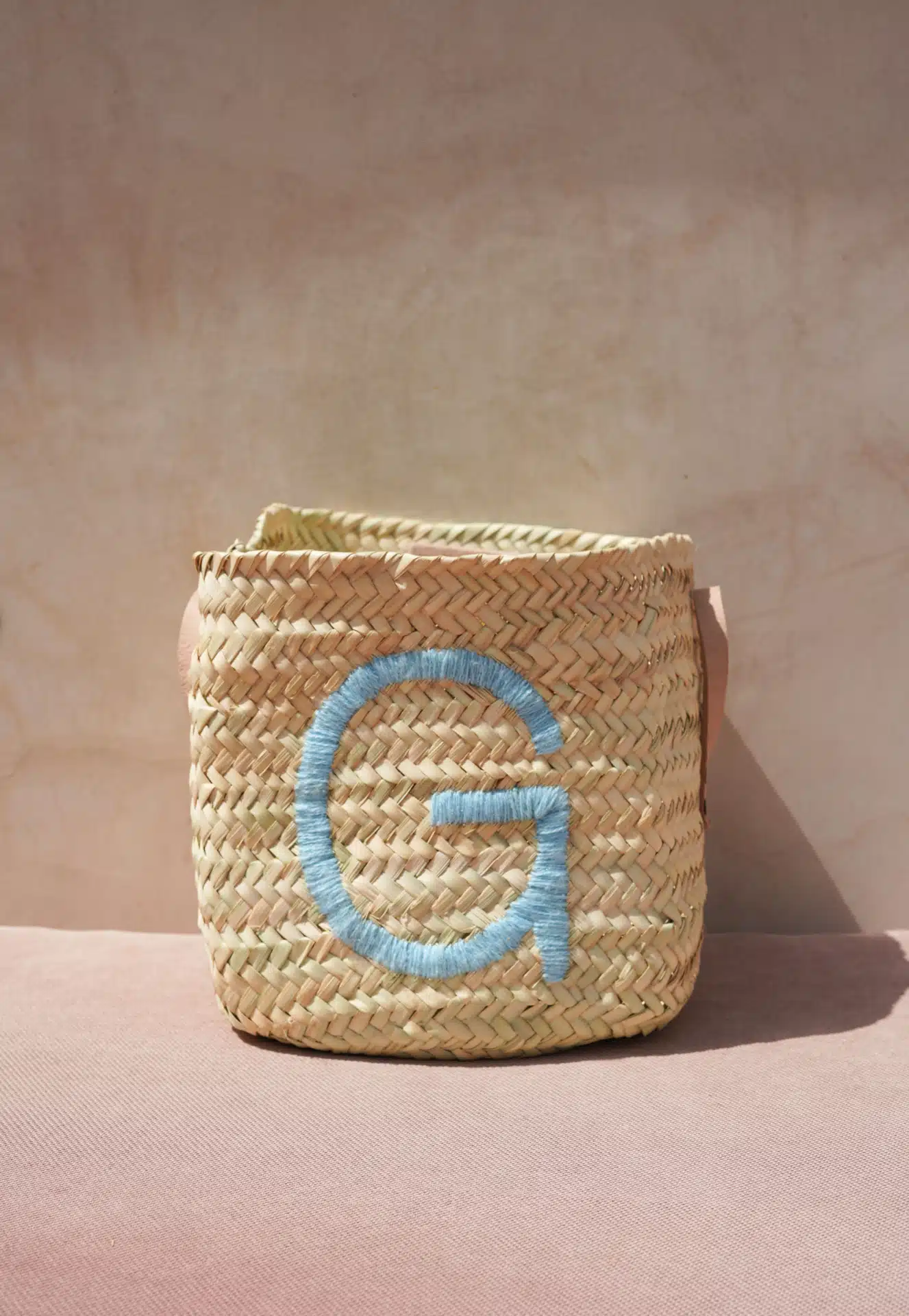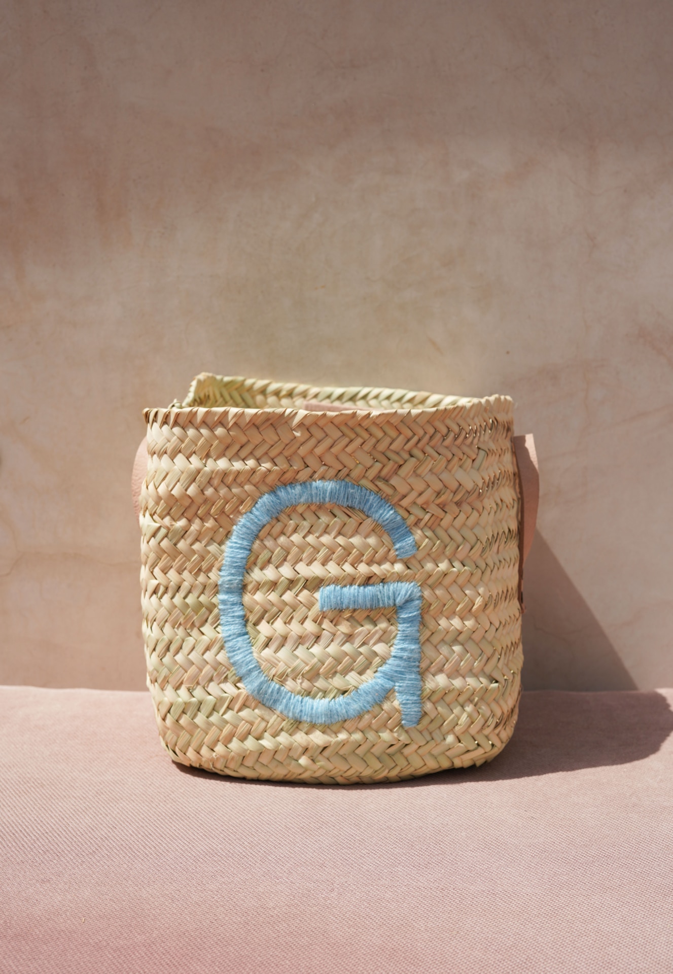 סל קלוע בעבודת יד מעלי דקל טבעיים, עם ידיות עור עמידות ואות G רקומה וגדולה בחזית. מושלם לארגון, לקישוט או כמתנה. שילוב יפהפה של מסורת ועבודת יד מוקפדת.