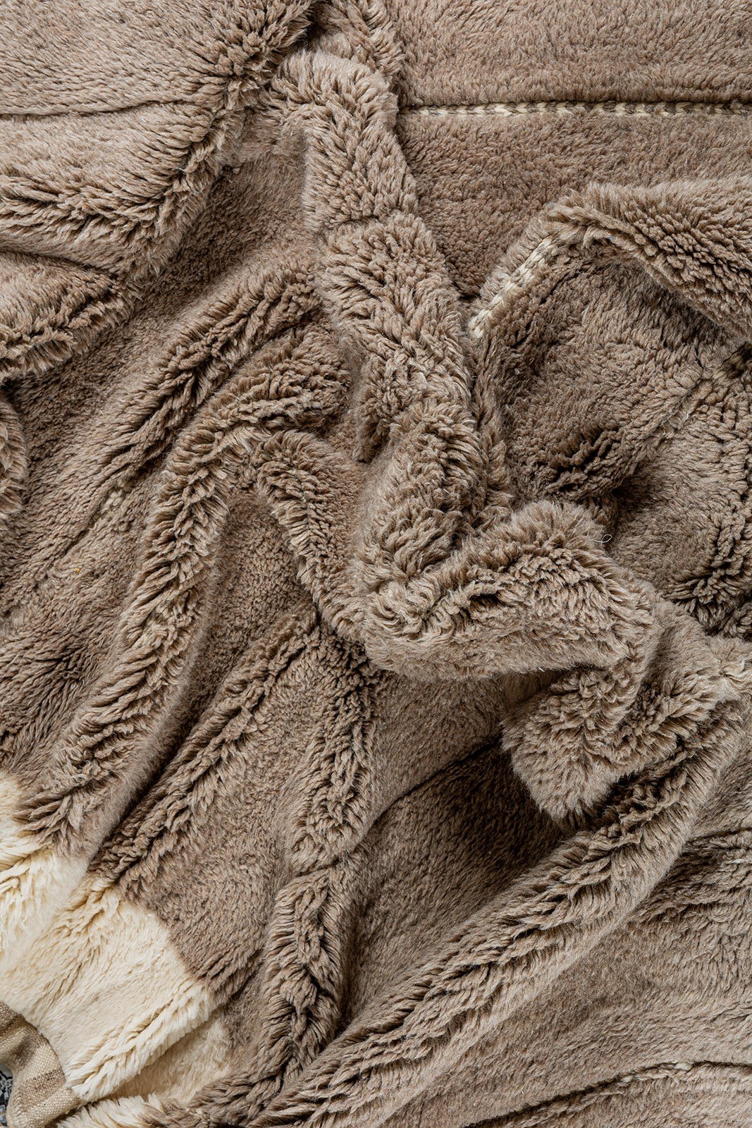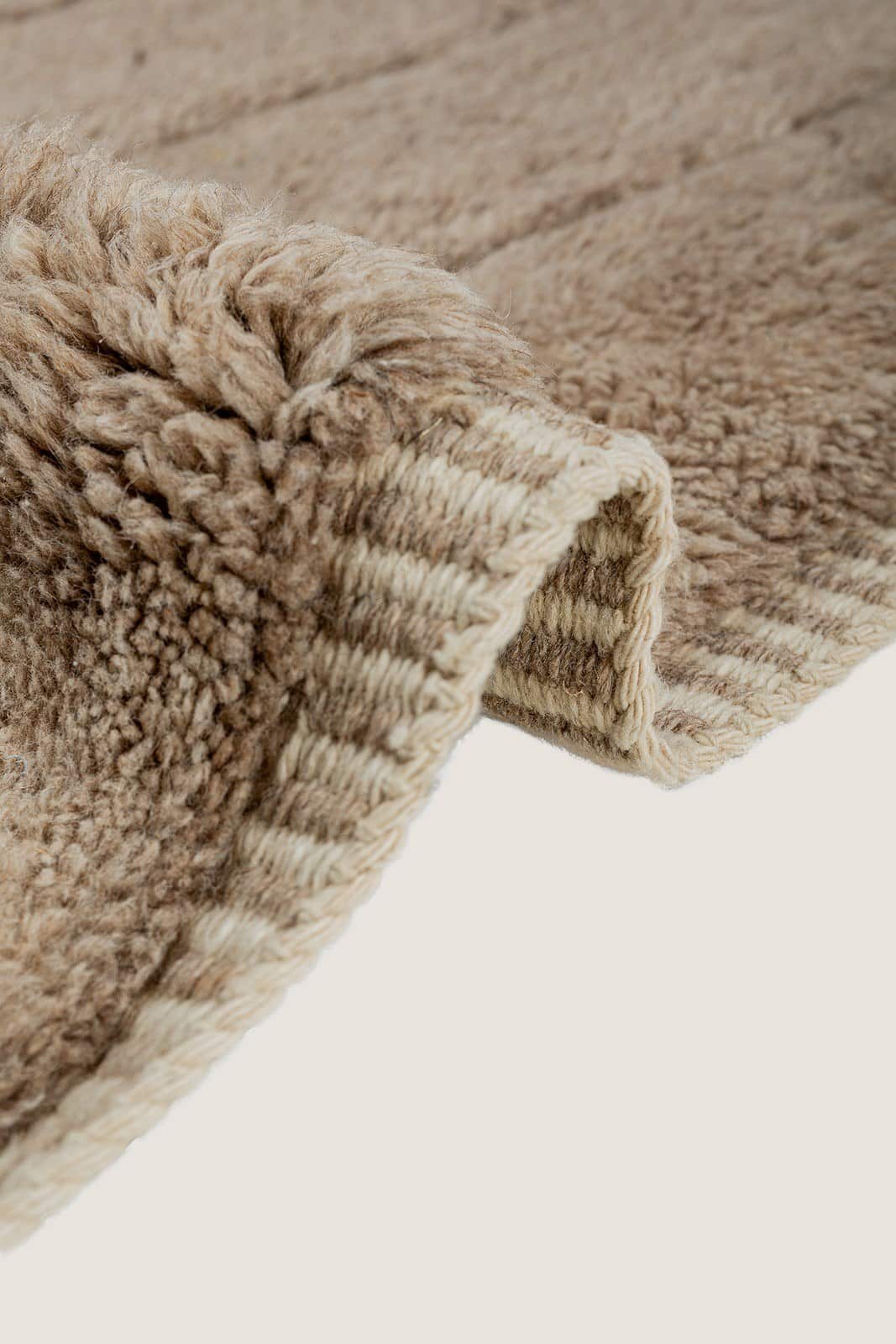 שטיח בני מרירת מרהיב זה נארג בעבודת יד במרוקו מצמר מובחר, בגוון חום אדמתי עשיר עם נגיעות שנהב עדינות בצדדים. המרקם הרך והקווים האופקיים המעודנים יוצרים מראה אלגנטי ומודרני, מה שהופך אותו לבחירה מושלמת לחללים עכשוויים ובוהמיינים.