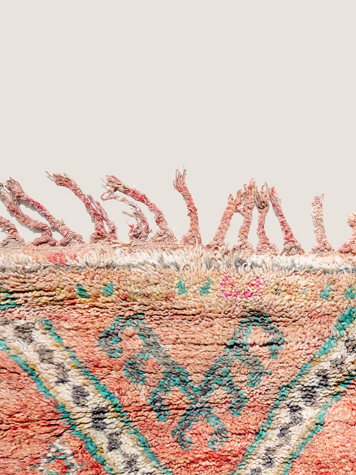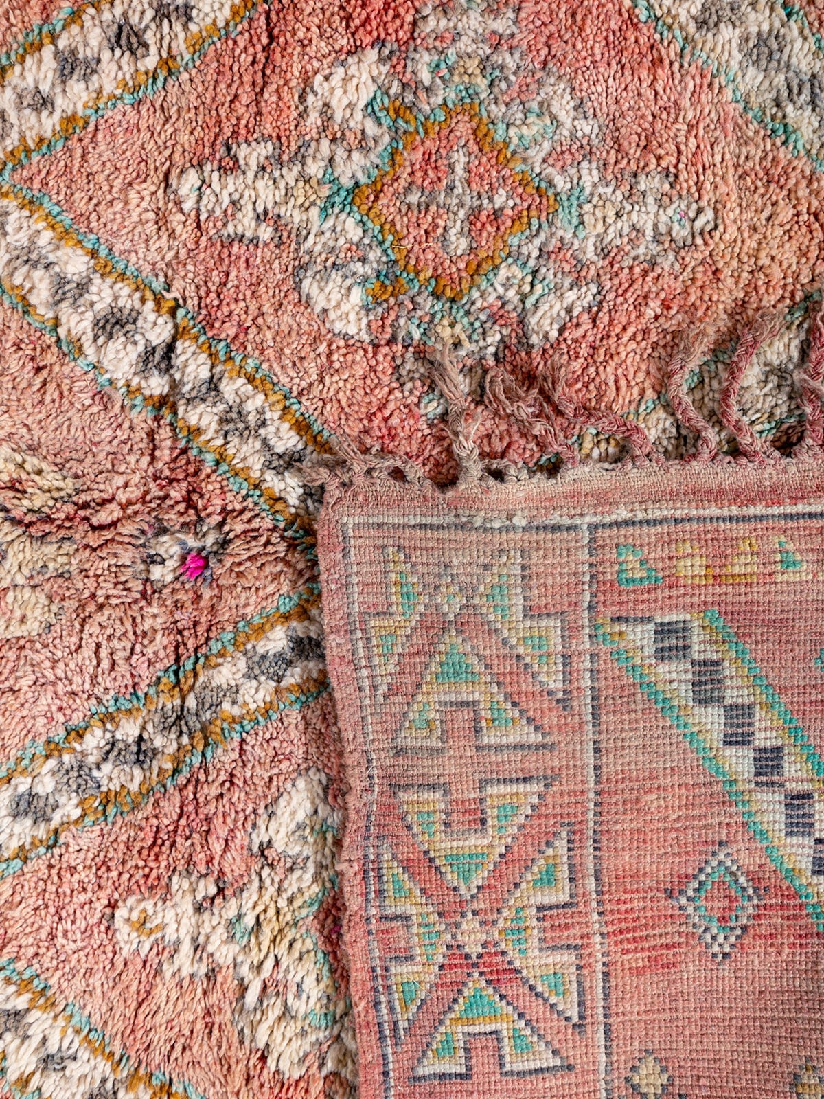 שטיח בני מגווילד מרהיב מהרי האטלס התיכון במרוקו, בעל דוגמת רשת יהלומים קלאסית וצבעים מרגשים. נארג בעבודת יד מצמר איכותי, עם מרקם רך ודיטייליס מורכבים שמוסיפים עומק ואופי. ההתיישנות הטבעית יוצרת עומק עשיר, מה שהופך את היצירה הייחודית הזו לייצוג אמיתי של אומנות ומורשת הברברים.