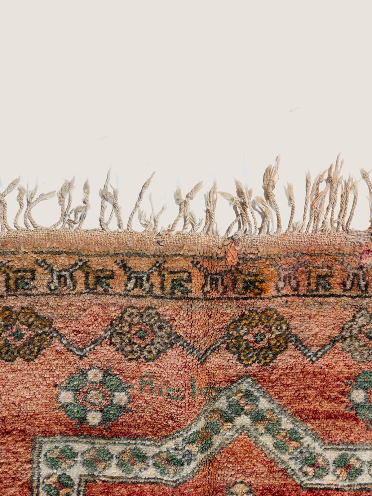 שטיח וינטג' מרוקאי יפהפה, בעל שילוב עשיר של גוונים חמים יחד עם דוגמאות מסורתיות. הסמלים הברבריים המופשטים המשולבים בעיצוב מעניקים לו נופך אישי וייחודי, מה שהופך אותו הן לפריט תרבותי והן לפריט דקורטיבי מרהיב. המרקם הרך והפרנזים מוסיפים לקסם האותנטי שלו.