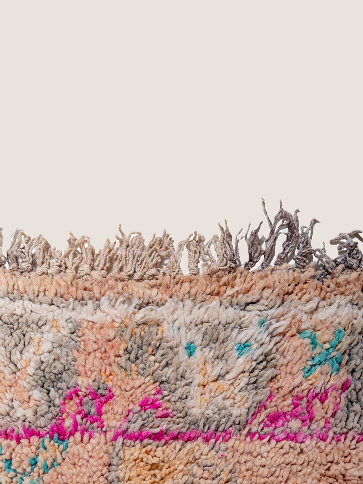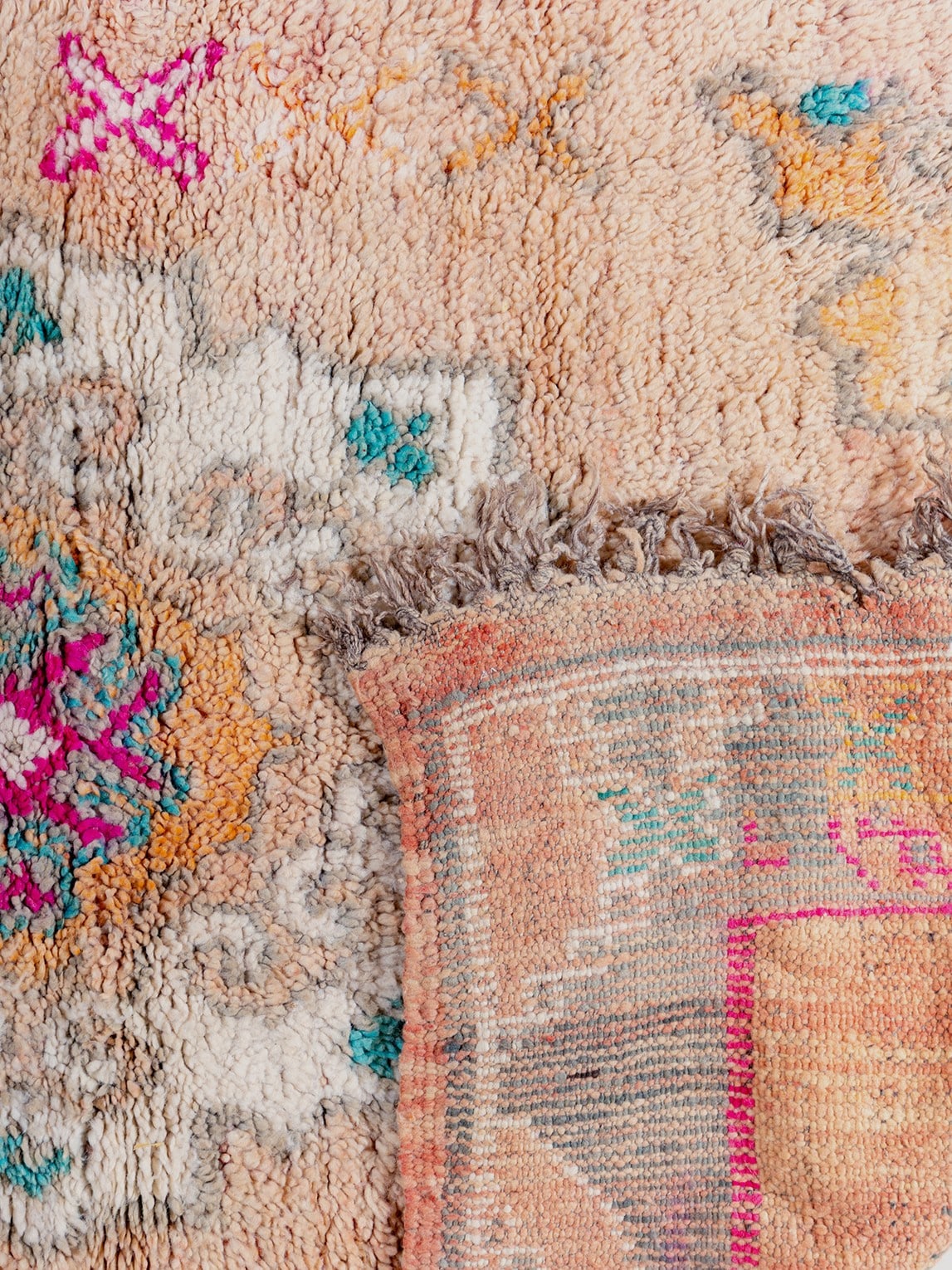 שטיח מרוקאי אותנטי, ארוג בעבודת יד מצמר טבעי. השילוב של גווני אפרסק, ירוק וורוד יחד עם דוגמאות גיאומטריות מורכבות יוצר מראה ייחודי וחם. פריט זה מביא נגיעה של אלגנטיות בוהמיינית לכל חלל ומספר סיפור של אומנות מסורתית.