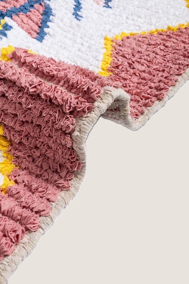 שטיח בושרוויט מטריף עם מעוינים בגווני כחול, צהוב וורוד. ארוג בעבודת יד מבדים ממוחזרים, עם מרקם רך וגדילים טבעיים בקצוות, השטיח הזה הוא תוספת מושלמת לכל חלל שרוצה לשדר חמימות, צבעוניות וסטייל בוהמי מתוחכם.