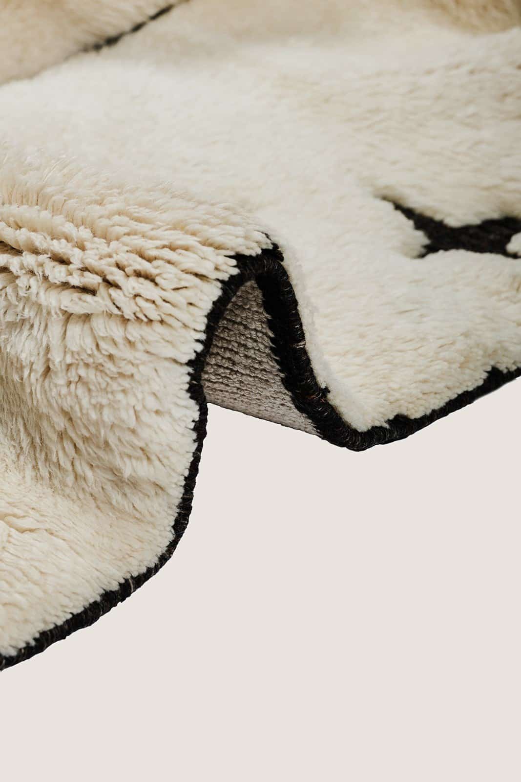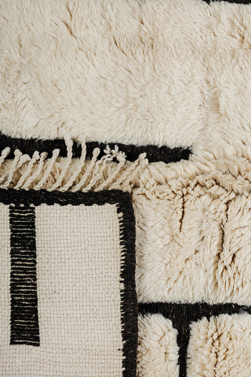 שטיח בני מרירת זה מציג עיצוב מודרני עם קווים גיאומטריים שחורים על רקע צמר שנהב רך. נארג בעבודת יד במרוקו מצמר איכותי ביותר, והוא מציע מרקם מפנק ורמת גימור יוצאת דופן. הדוגמה האבסטרקטית מוסיפה מראה עכשווי, תוך שמירה על האלגנטיות הנצחית של שטיחי הברבר המסורתיים.