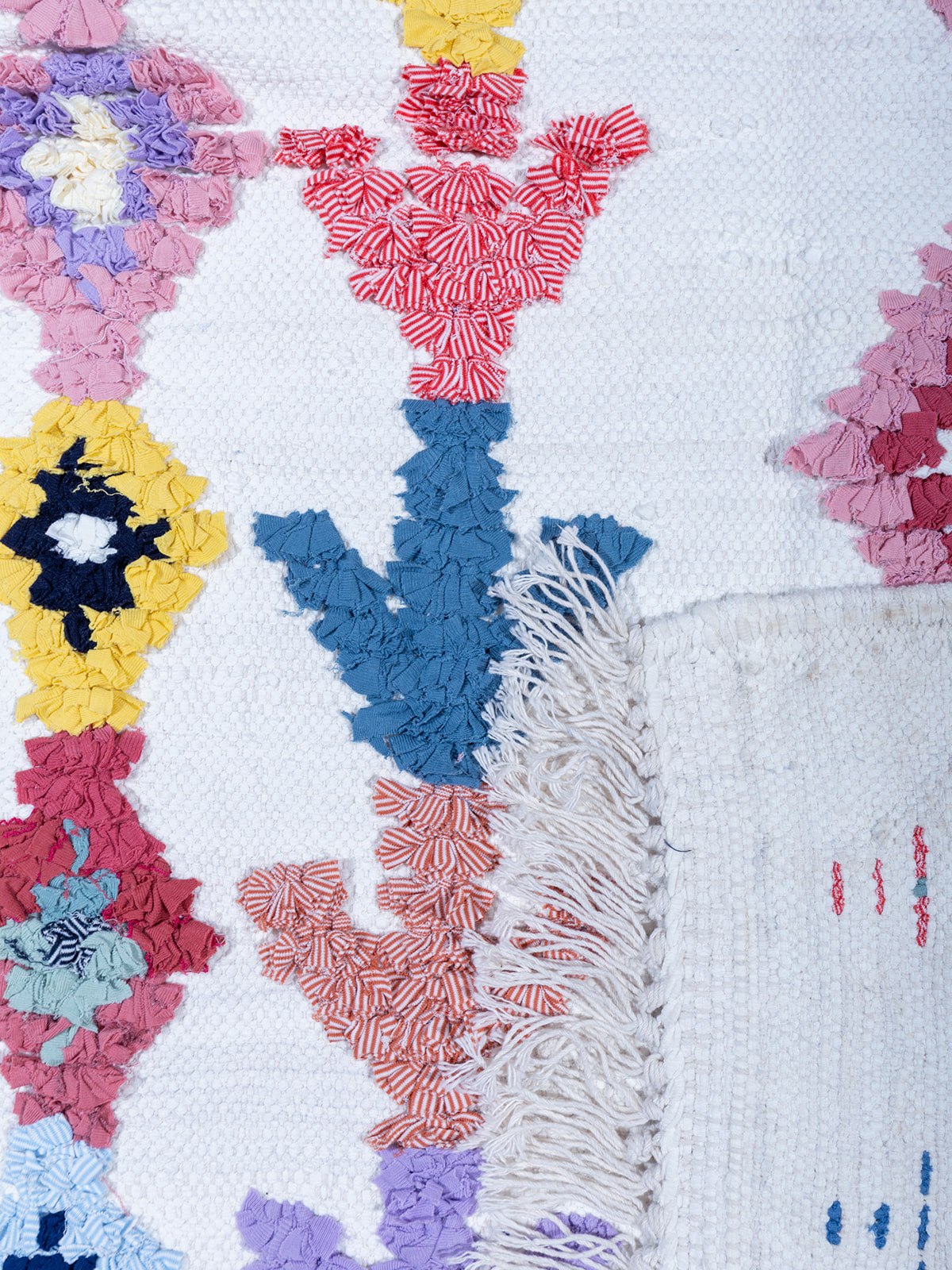 שטיח בושרוויט מרוקאי בעבודת יד, מלא בצבעים חיים ודוגמאות אתניות מהפנטות. עשוי מבדים ממוחזרים, משלב מסורת ועיצוב אקולוגי. תוספת מושלמת לכל חלל עם טאץ' בוהמי וחמים.