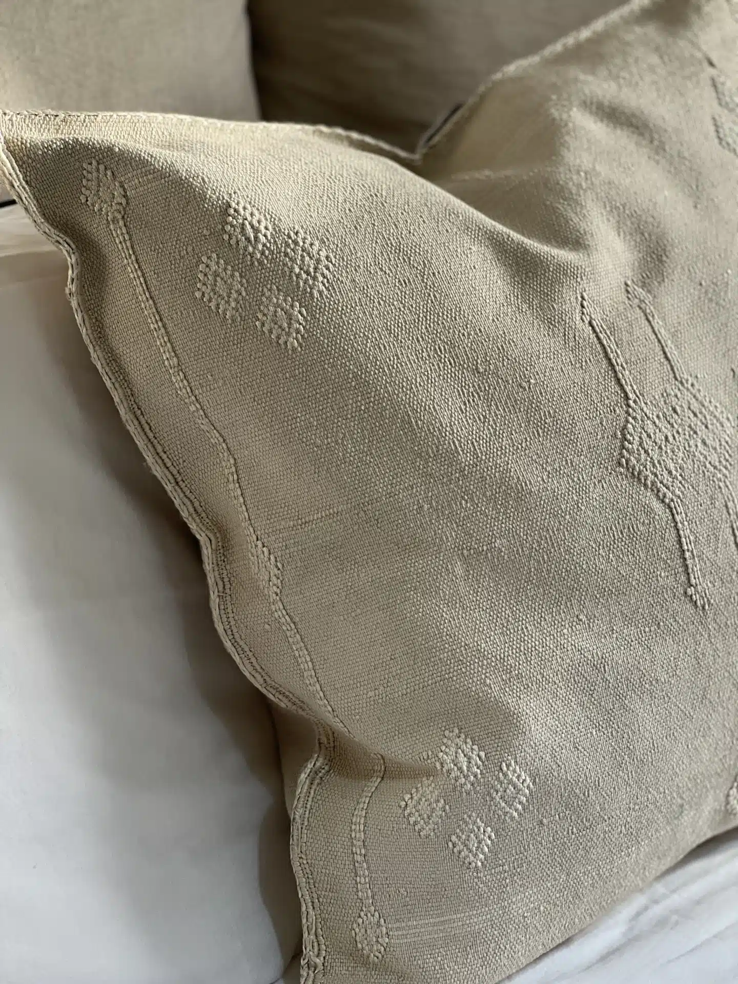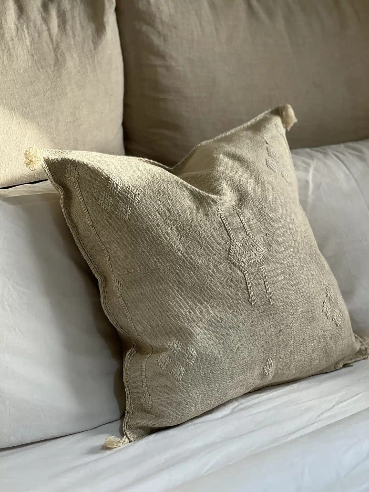 כרית מרוקאית בעבודת יד מבד משי קקטוס בצבע בייג' עם מוטיבים ברברים מסורתיים. כל כרית היא יחידה במינה ומוסיפה נגיעה טבעית, רכה ומיוחדת לכל חלל.