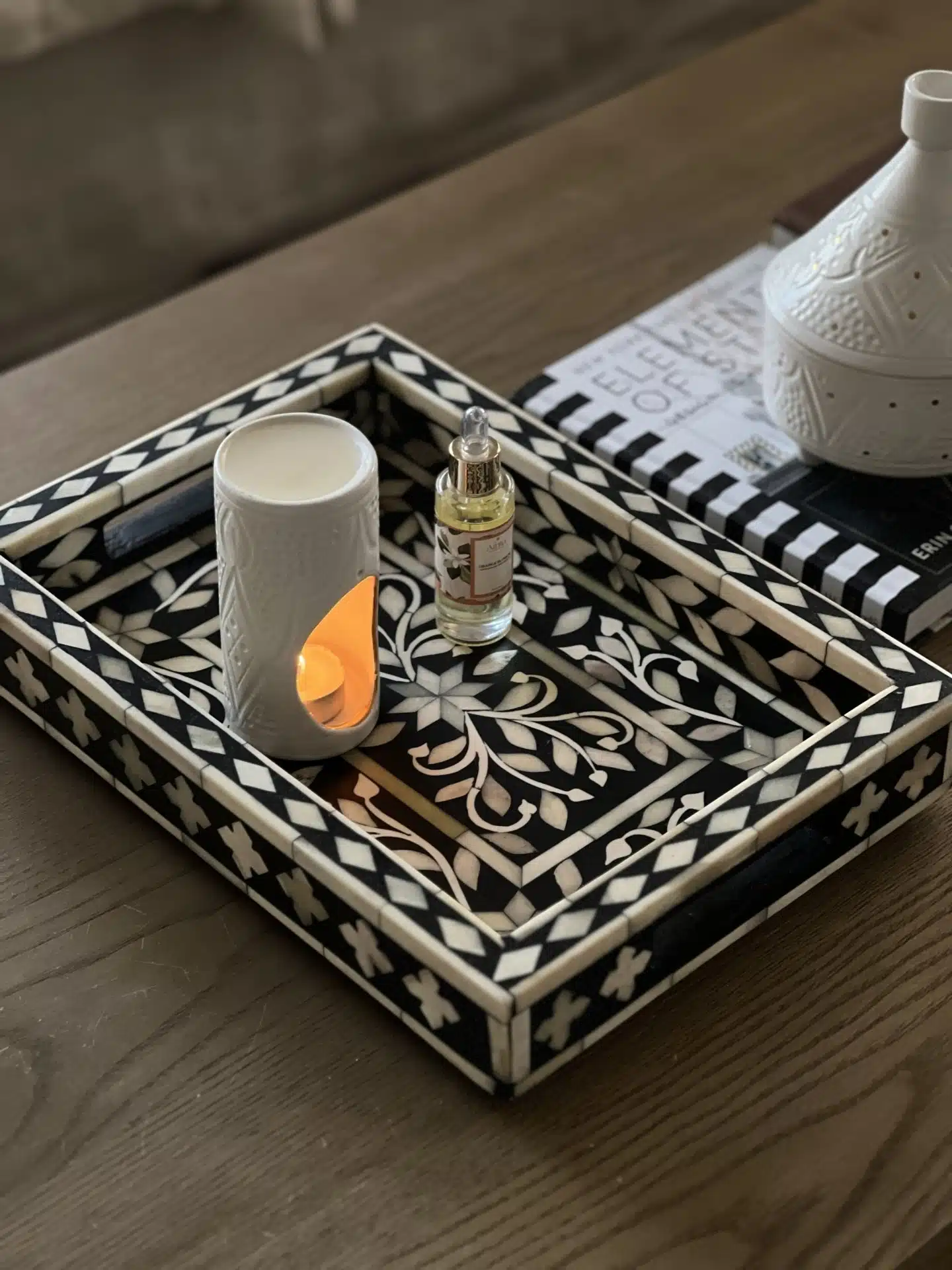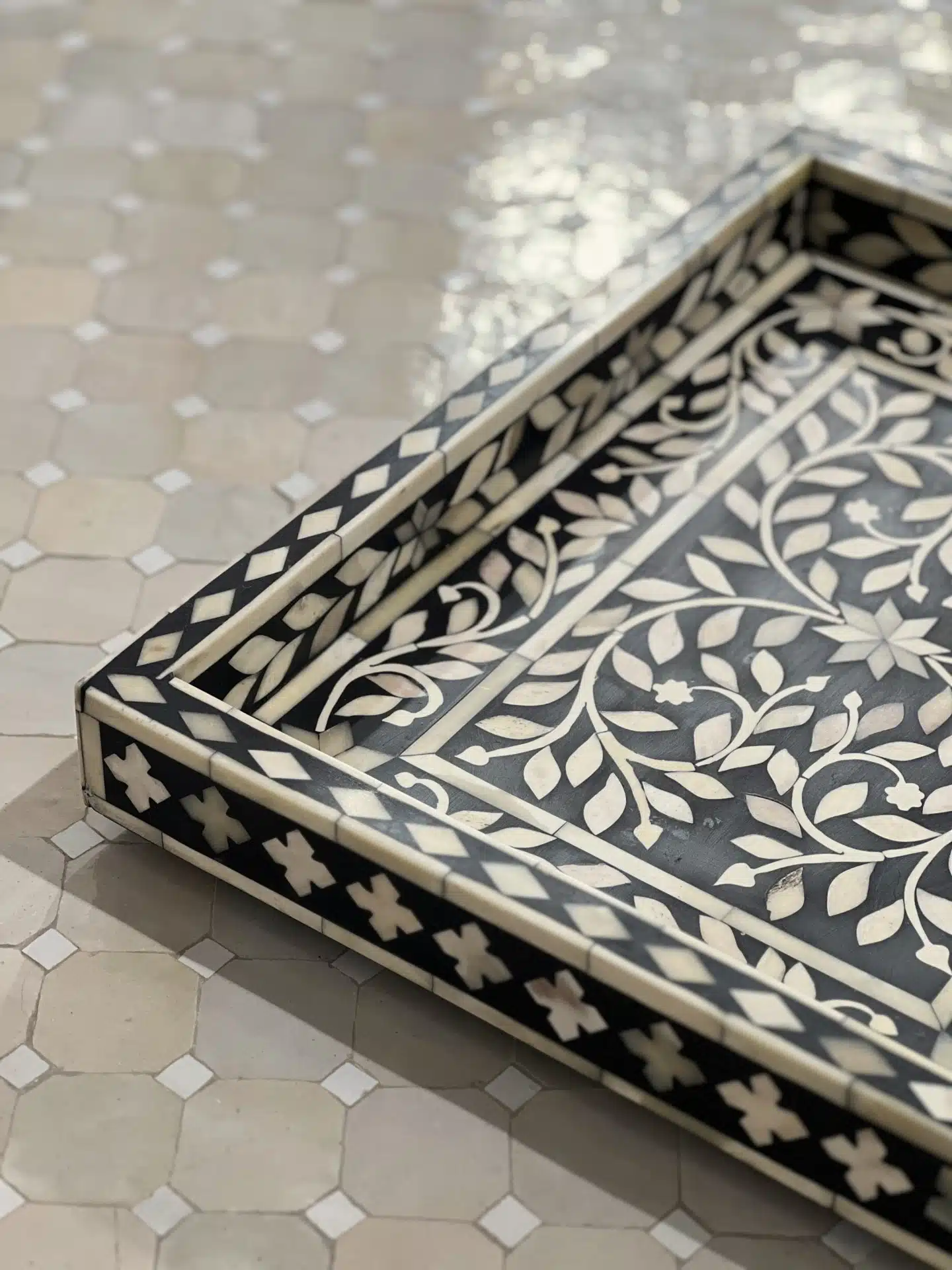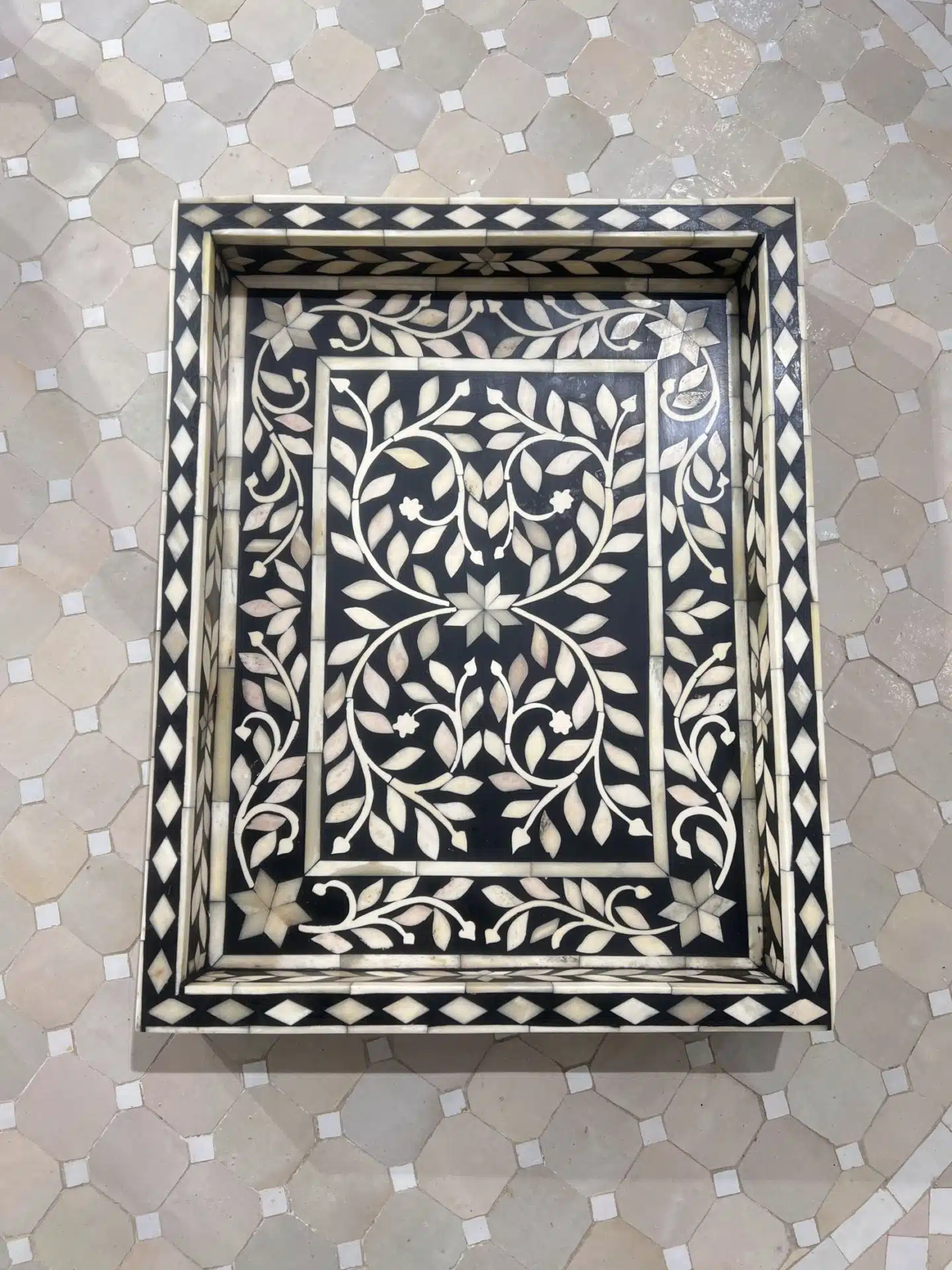 מגש בשיבוץ עצם בעבודת יד. כל עלה ופרח שזורים בקווים מדויקים של עצם טבעית, בעיטור שחור דרמטי שמכניס עומק ויוקרה. פריט שמביא איתו ניחוח של אלגנטיות כפרית, ומשדרג כל פינה בבית.