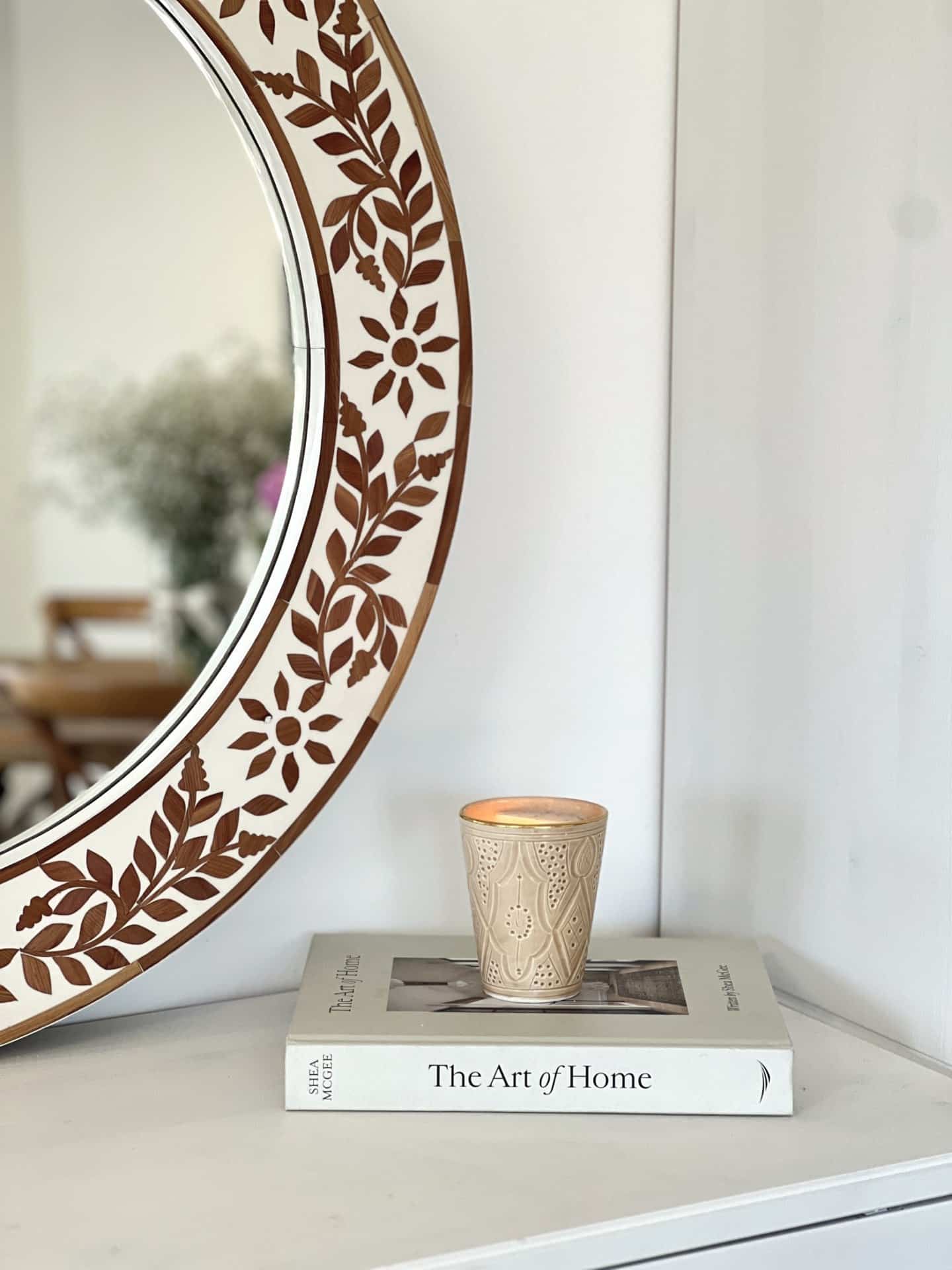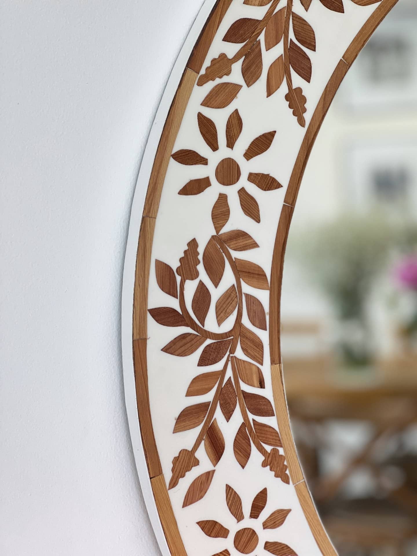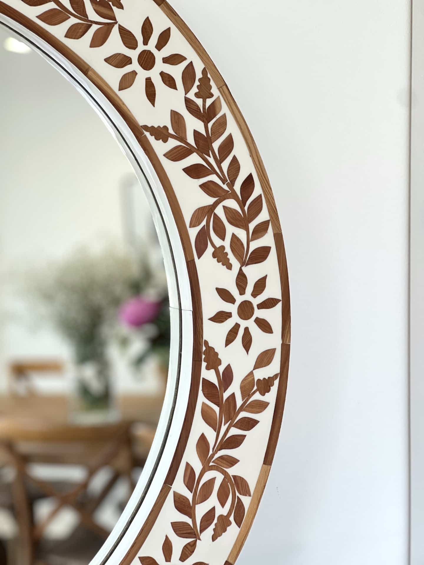 מראה עגולה מהפנטת בשיבוץ עץ בעבודת יד. כל חלק שובץ בקפידה ליצירת דוגמה פרחונית עשירה, שמביאה איתה עומק, הרמוניה ואלגנטיות טבעית. מושלמת לכניסה, מעל קונסולה או בכל חלל שמבקש נגיעה של יופי ייחודי.