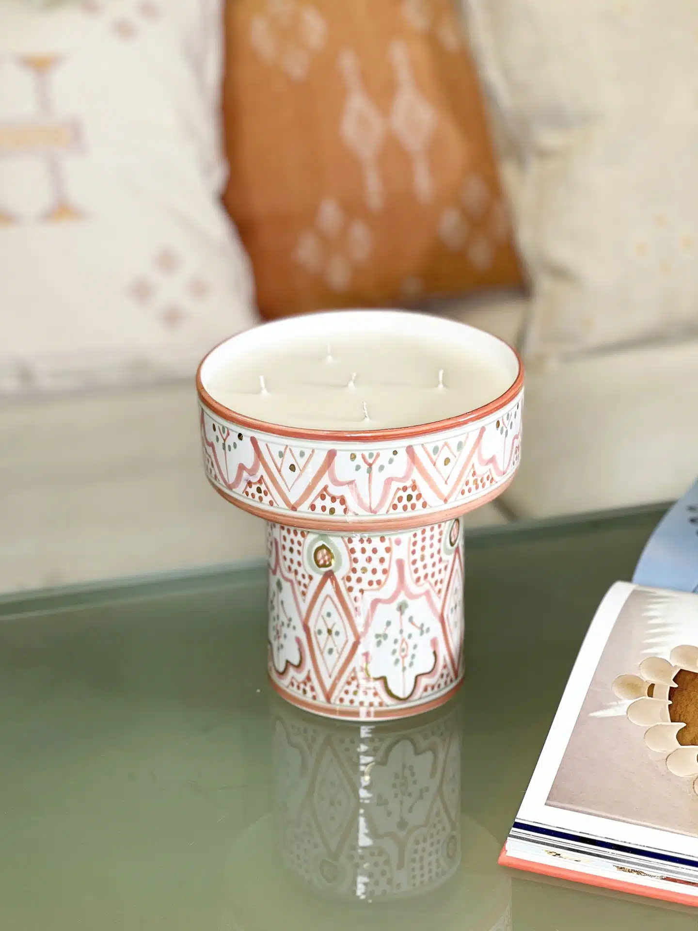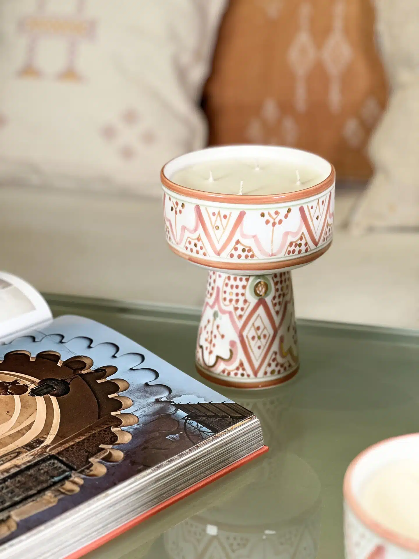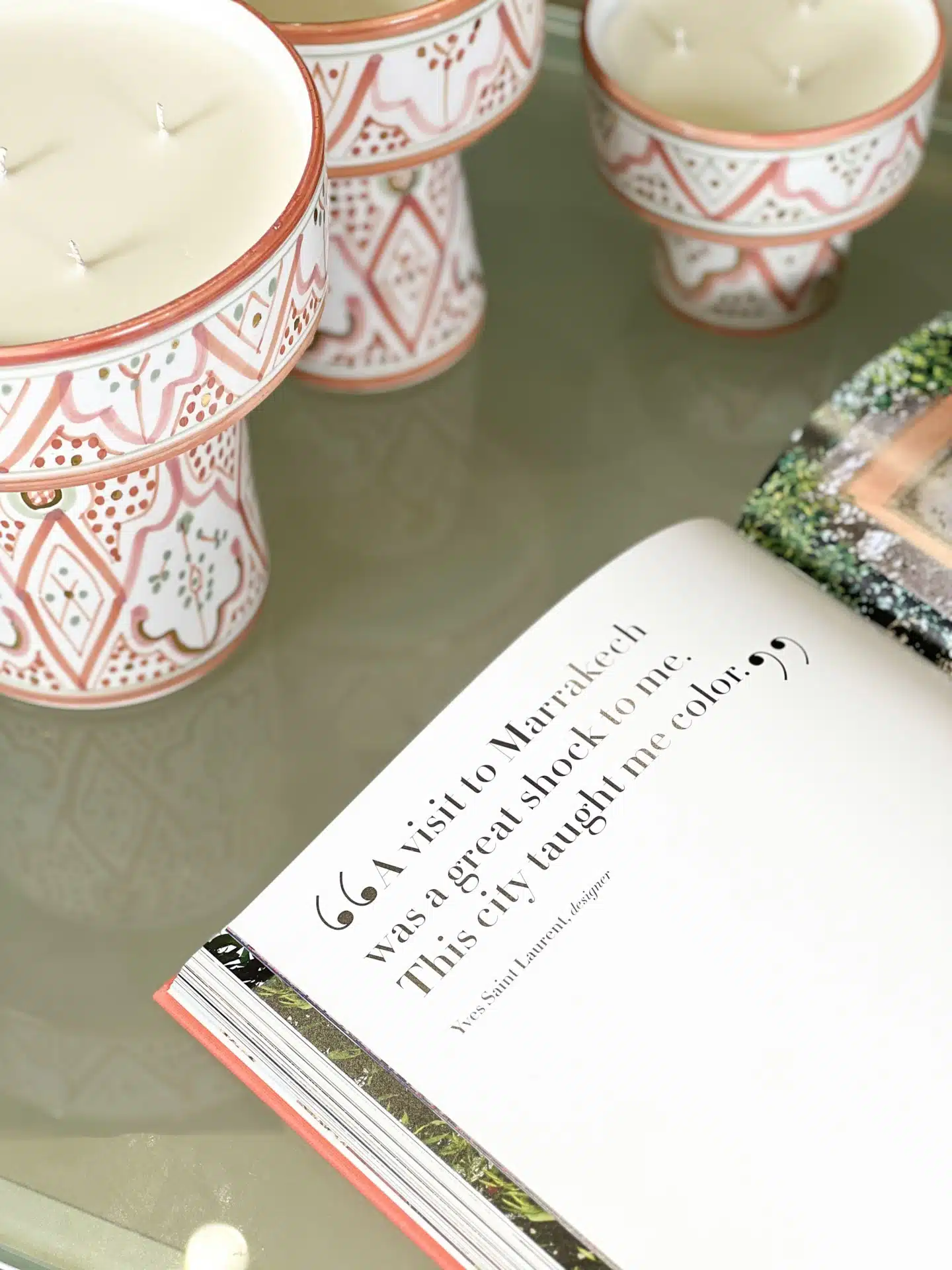 הנרות עשויים משעוות סויה טבעית, עם פתילים איכותיים לבעירה נקייה ואחידה. הם מגיעים בכלי קרמיקה ייחודיים שנוצרים במיוחד כדי להמשיך לשרת אתכם גם לאחר שהנר נגמר. תערובות הריח נרקחות משמנים אתריים וטבעיים, המבוססים על צמחים שנבחרים בקפידה ליצירת חוויית ריח עמוקה של גנים מרוקאים קסומים.