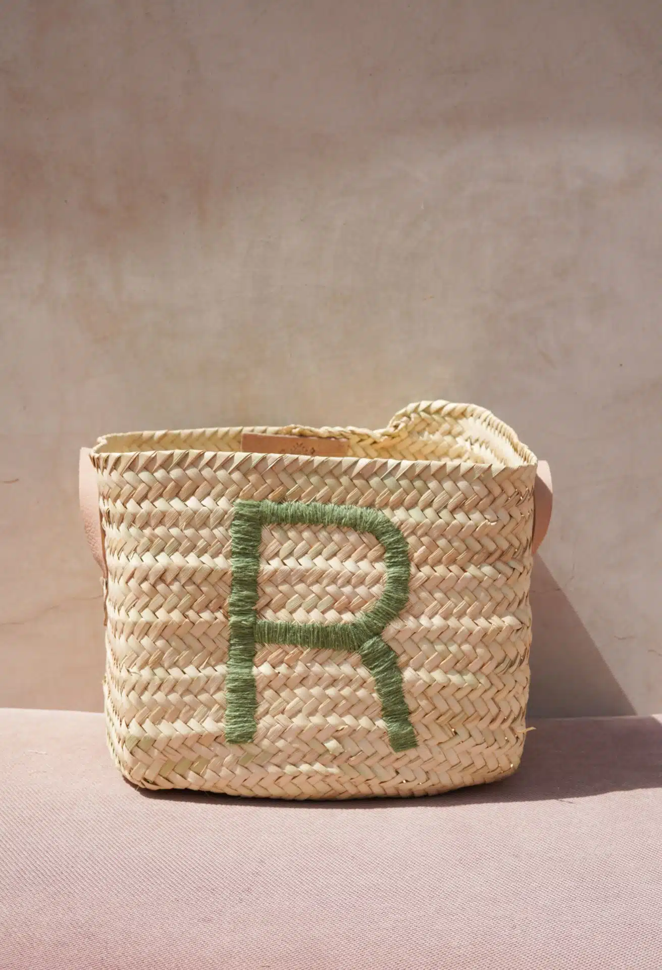סל קלוע בעבודת יד מעלי דקל טבעיים, עם ידיות עור עמידות ואות R רקומה וגדולה בחזית. מושלם לארגון, לקישוט או כמתנה. שילוב יפהפה של מסורת ועבודת יד מוקפדת.