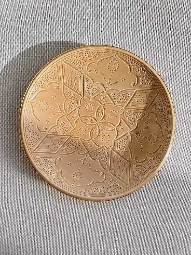 צלחת גדולה ומרהיבה, חרוטה בעבודת יד, מקושטת בזהב 12K. מושלמת להגשת מנות גדולות או כצלחת פירות.