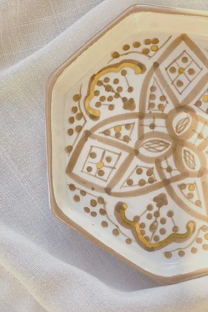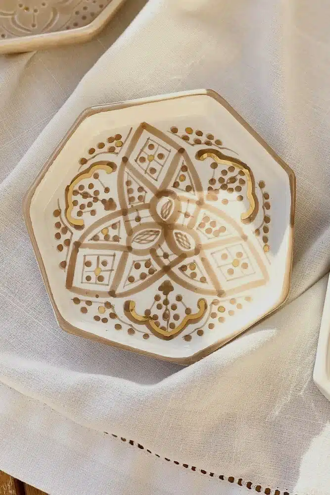 צלחת מרוקאית מעוצבת בעבודת יד, מקושטת בזהב 12K. מושלמת להגשת סלטים קטנים, או כמגש תכשיטים יפה.
