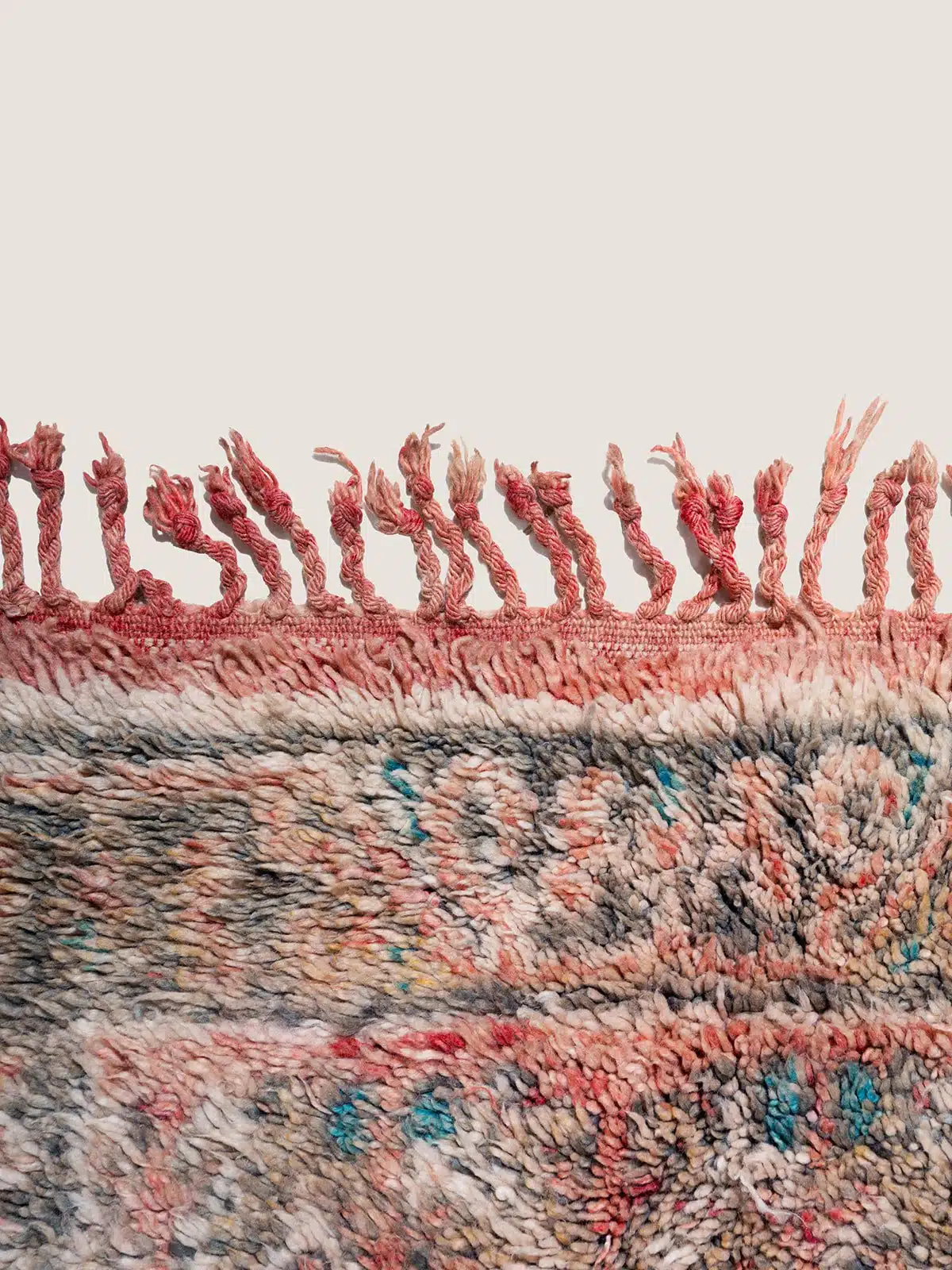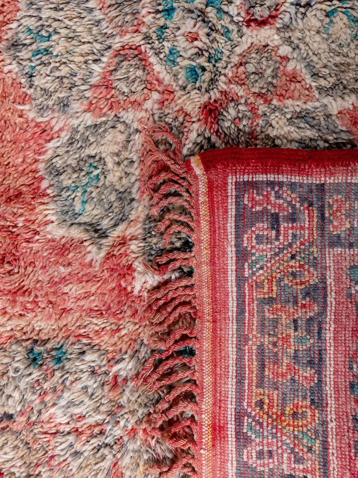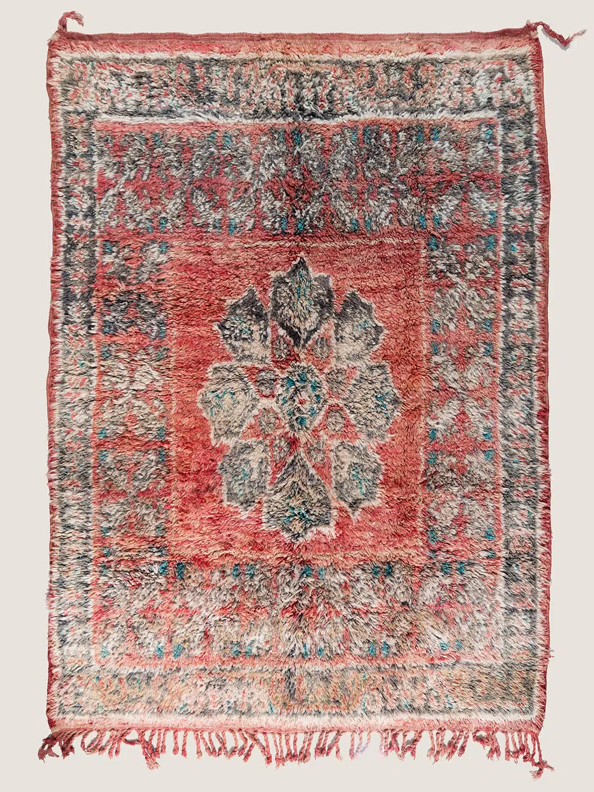 שטיח צמר מרוקאי עבודת יד המתאפיין בפלטת צבעים חמה של אדום-קורל ופחם ובדוגמת מדליון דומיננטית. השילוב בין הצבעוניות העשירה לעיטורים הברבריים המסורתיים מוסיף חמימות גולמית ואותנטיות לכל חלל מעוצב.
