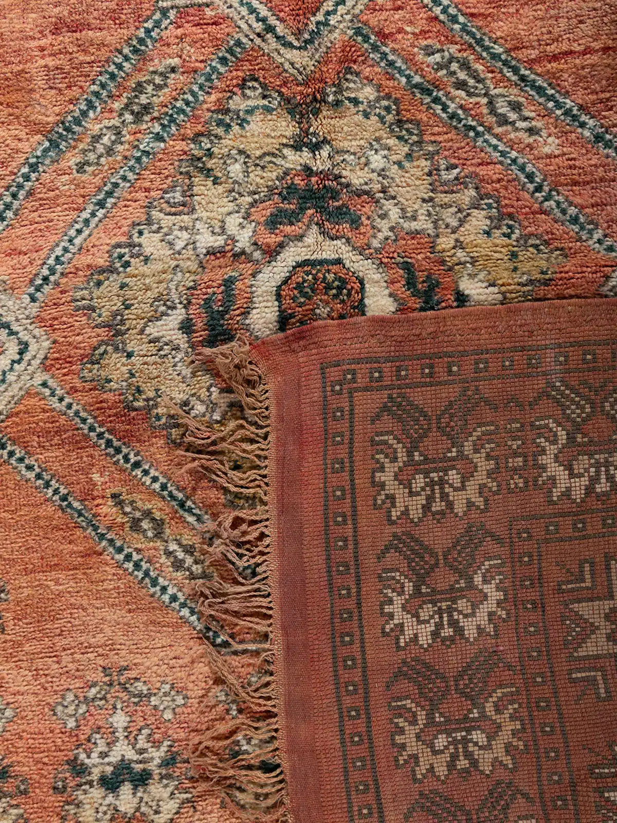 שטיח וינטג' מרוקאי יפהפה, בעל שילוב עשיר של גוונים חמים יחד עם דוגמאות מסורתיות. הסמלים הברבריים המופשטים המשולבים בעיצוב מעניקים לו נופך אישי וייחודי, מה שהופך אותו הן לפריט תרבותי והן לפריט דקורטיבי מרהיב. המרקם הרך והפרנזים מוסיפים לקסם האותנטי שלו.