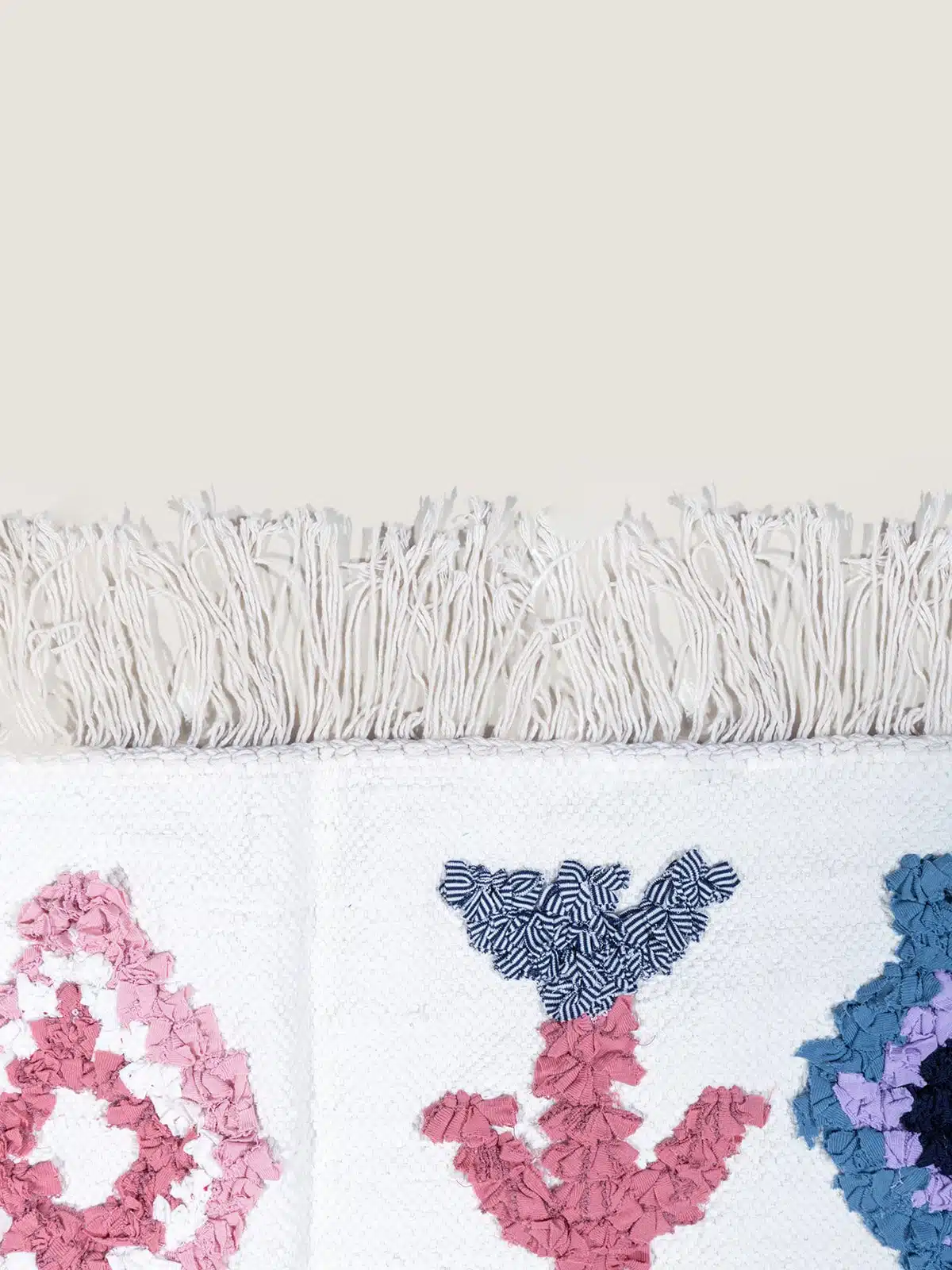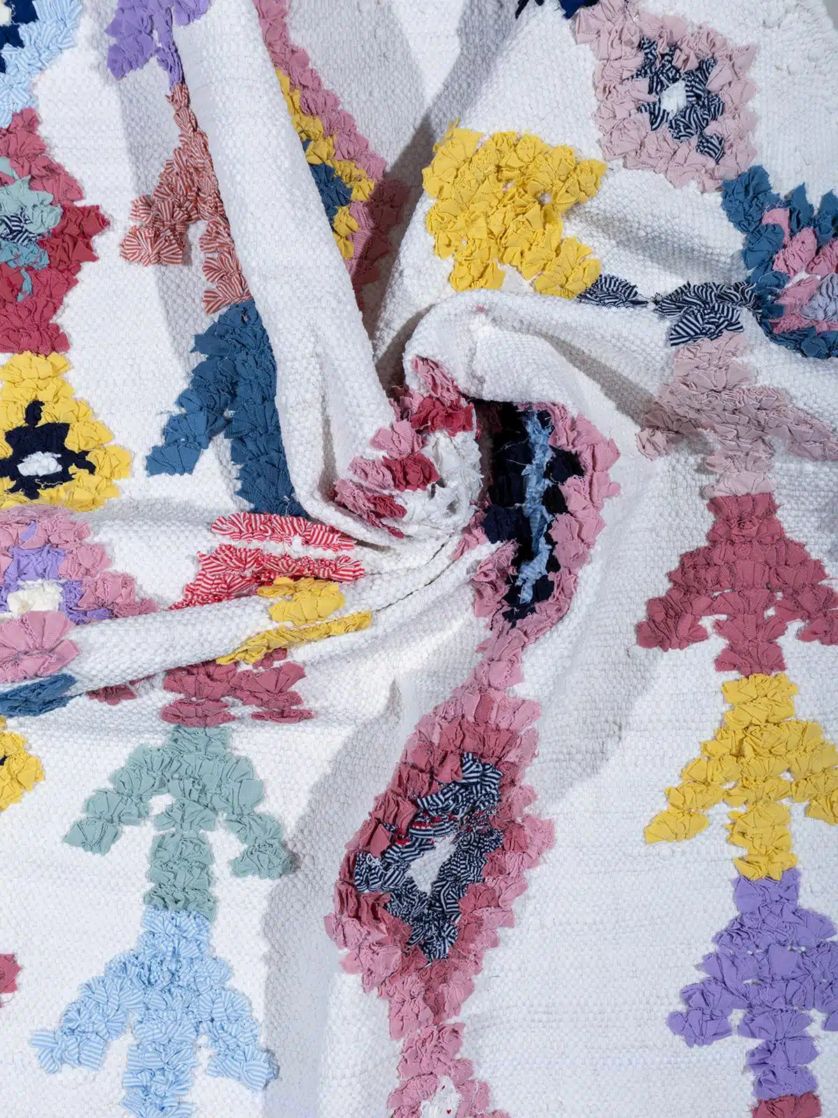שטיח בושרוויט מרוקאי בעבודת יד, מלא בצבעים חיים ודוגמאות אתניות מהפנטות. עשוי מבדים ממוחזרים, משלב מסורת ועיצוב אקולוגי. תוספת מושלמת לכל חלל עם טאץ' בוהמי וחמים.