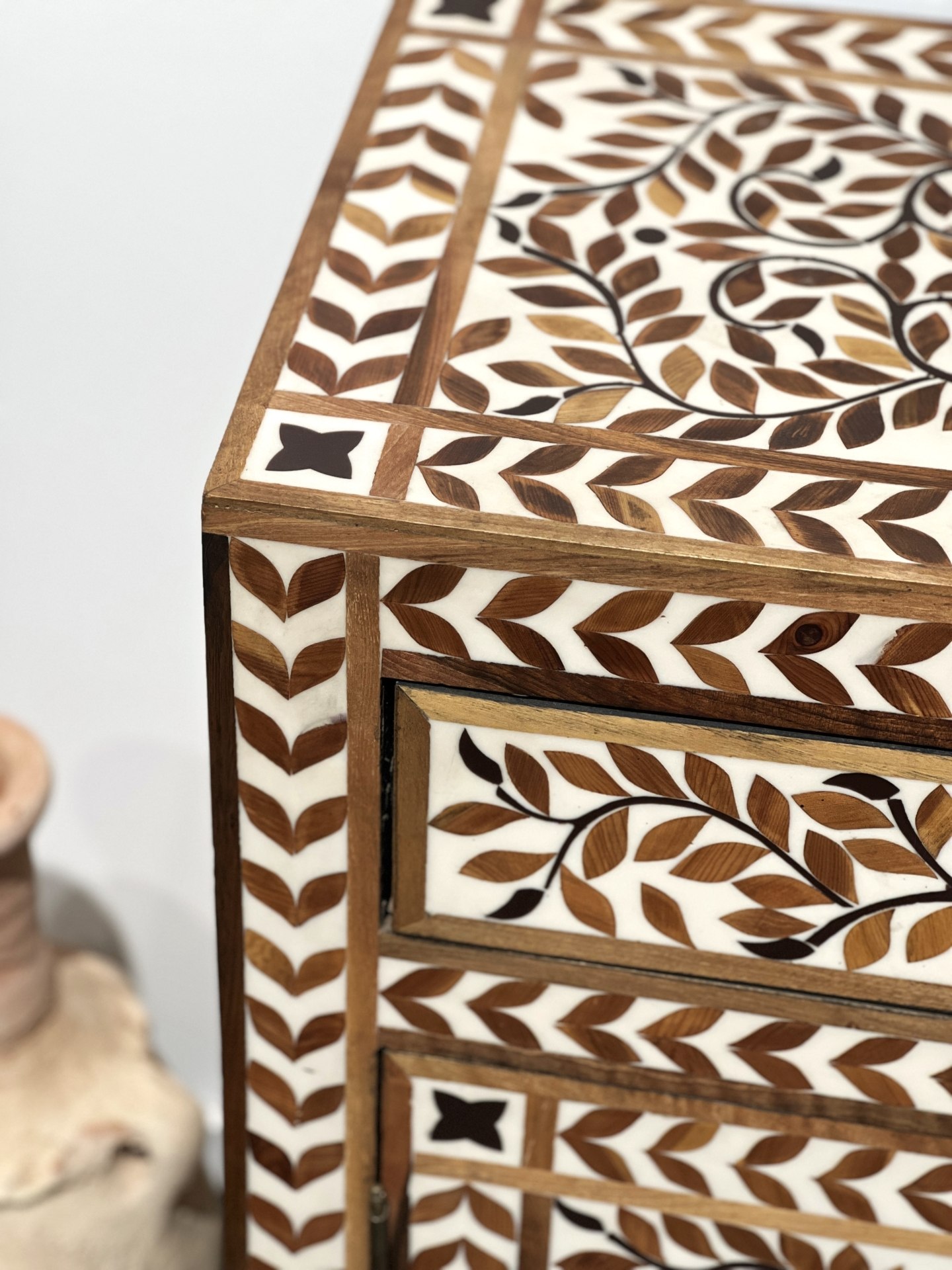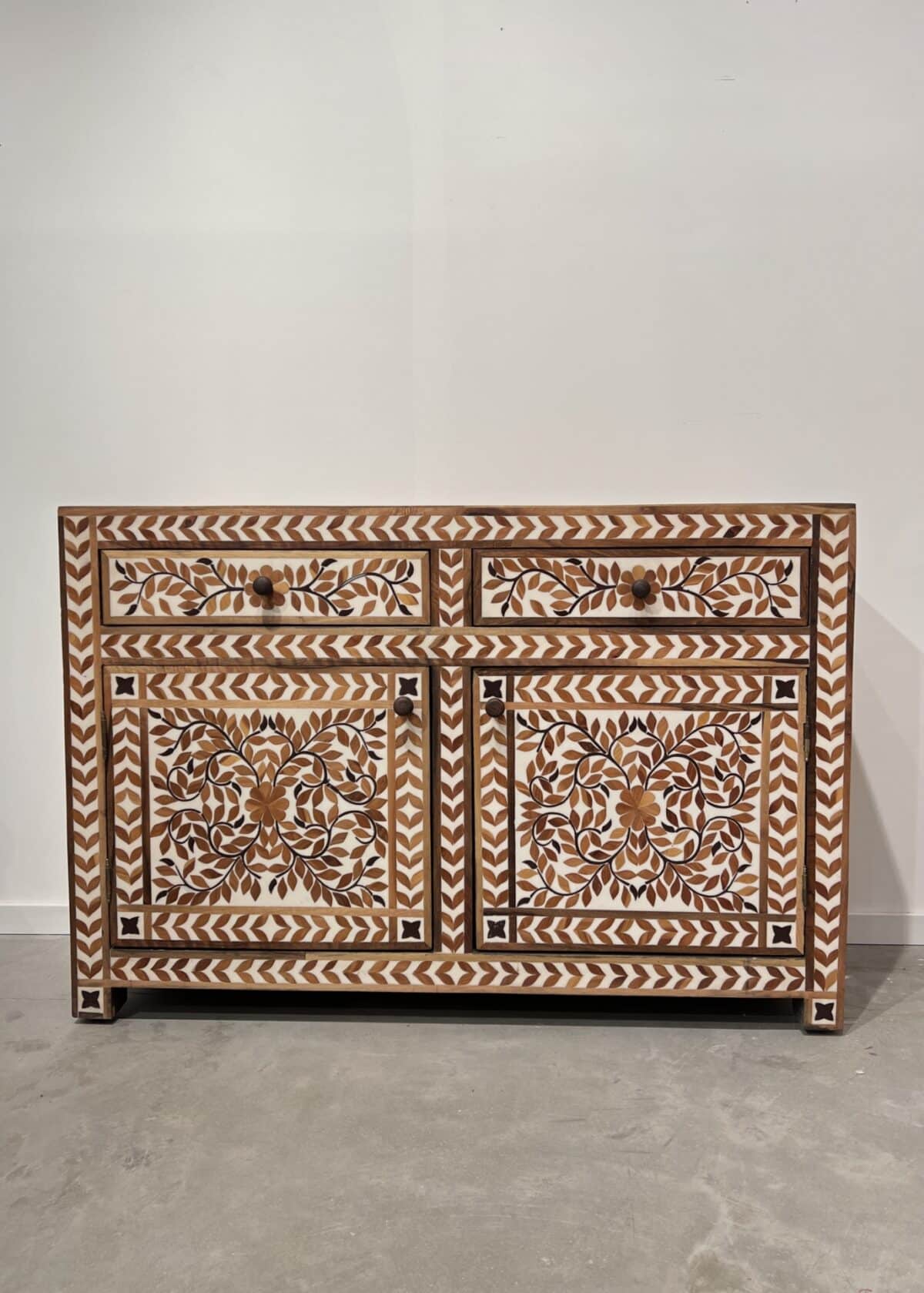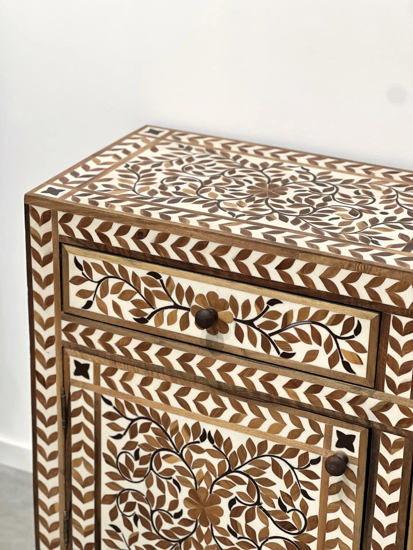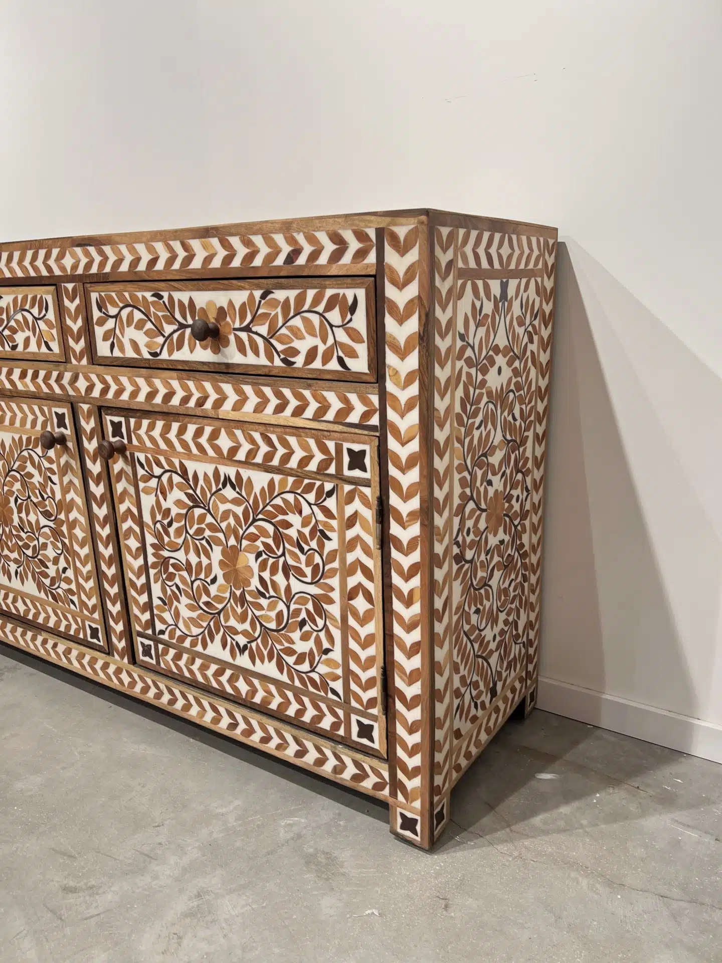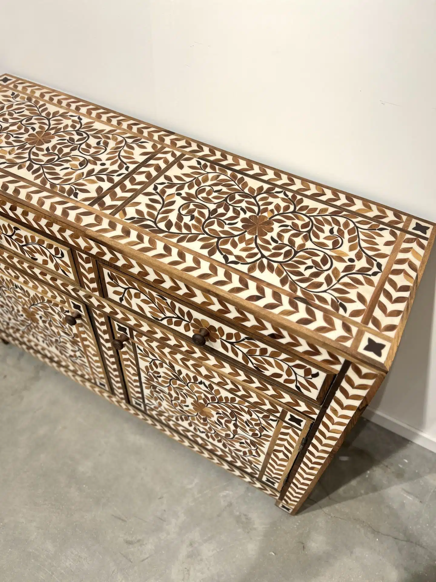 מזנון עץ משובץ בעבודת יד, עם דוגמת עלים קלאסית בגוונים טבעיים. השיבוץ נעשה בעץ מלא ושרף בהיר, בטכניקה מסורתית שמחברת בין חומר, סבלנות ואומנות. כל פרט מגולף בקפידה על ידי אומנים מיומנים ליצירת רהיט חד-פעמי שמכניס חמימות, עומק ויופי על-זמני אל תוך הבית.