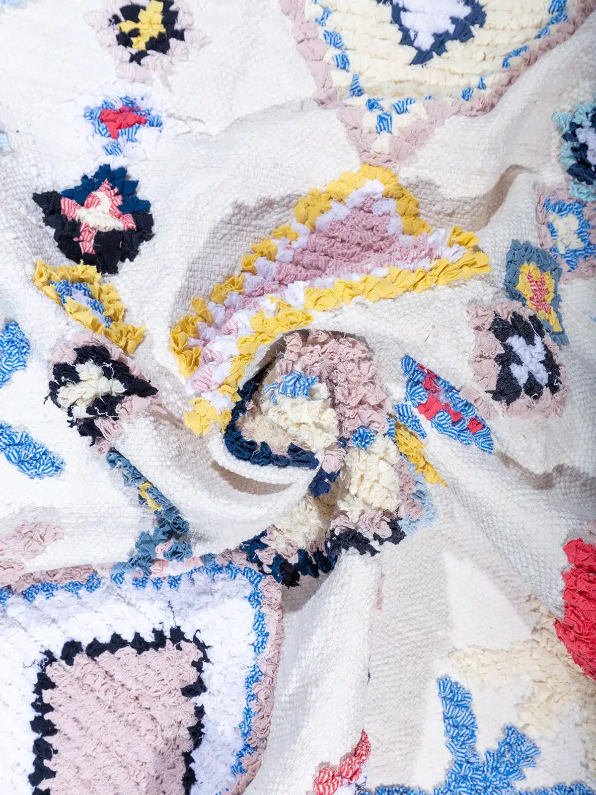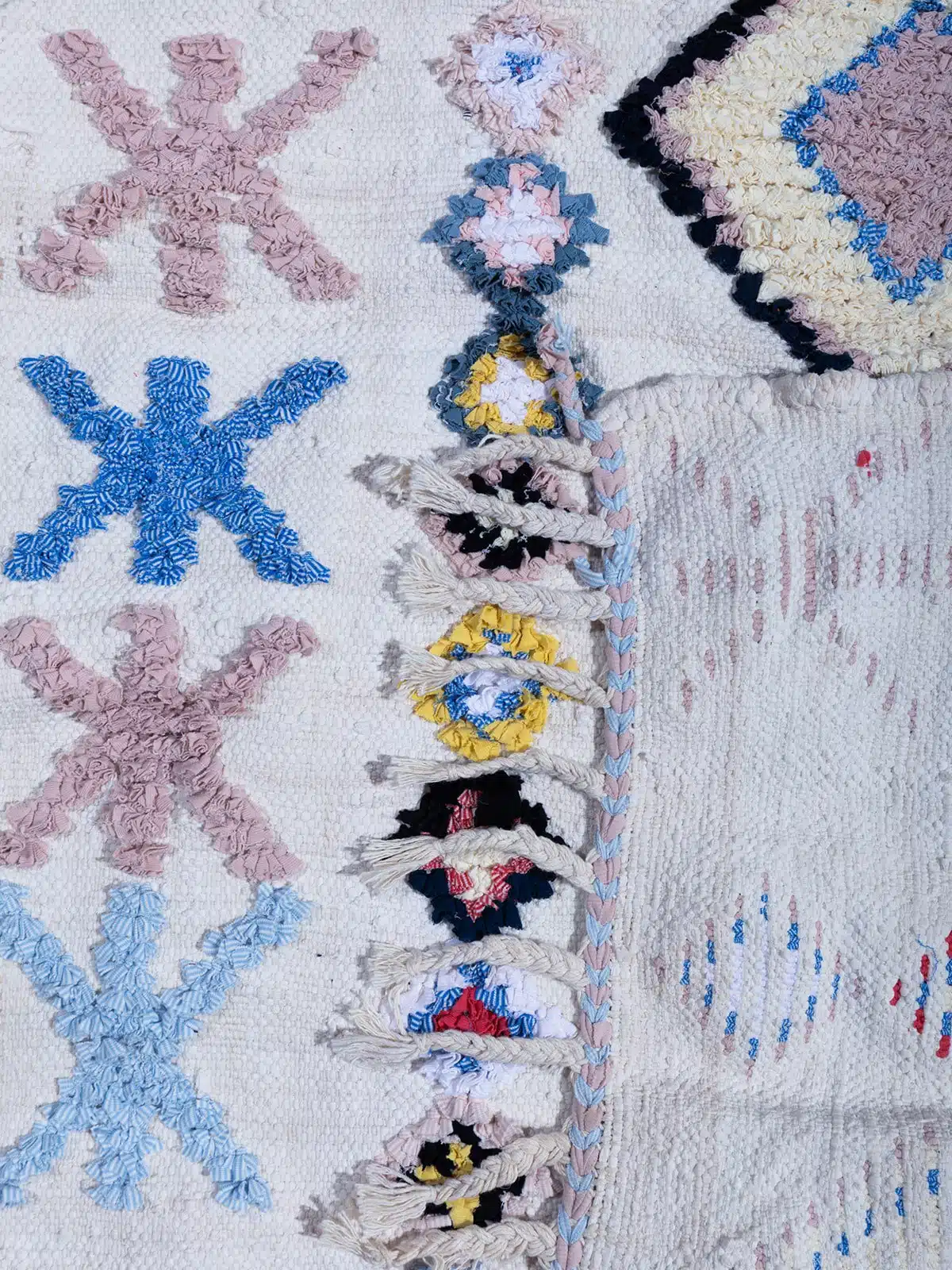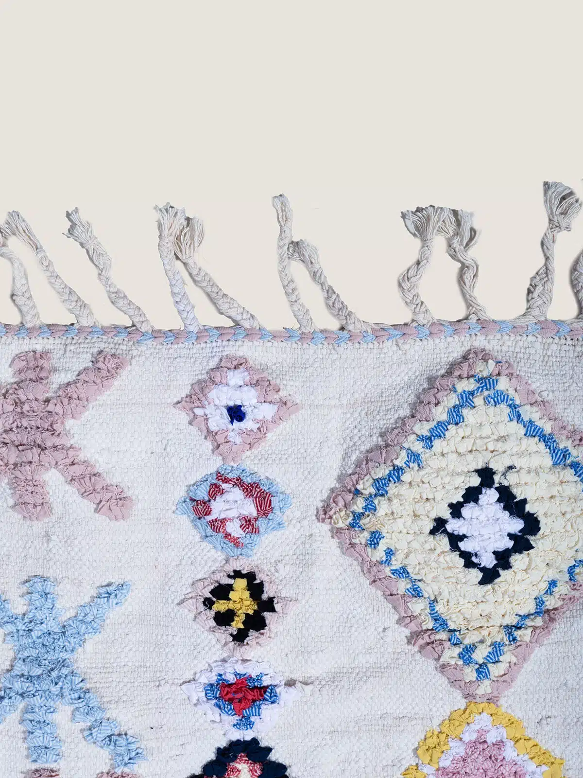 שטיח בושרוויט צבעוני עשוי בעבודת יד עם דוגמת מעוינים גיאומטרית צבעונית. עשוי מבדים ממוחזרים, ומשלב מסורת מרוקאית עם קיימות. תוספת מושלמת לעיצוב חדר הילדים.
