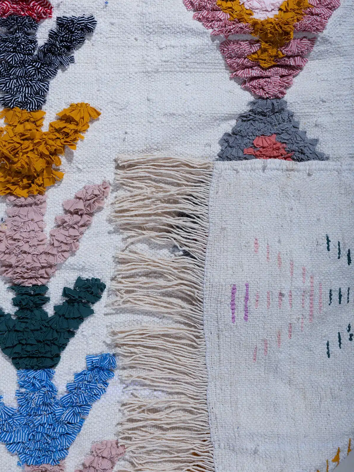 שטיח בושרוויט מרהיב בעבודת יד, עשוי מבדים ממוחזרים, עם מעוינים צבעוניים ודוגמאות גיאומטריות מורכבות. הצבעים הבולטים והמרקם הייחודי יוצרים שטיח מרוקאי אותנטי שמוסיף חמימות ואופי לכל בית.