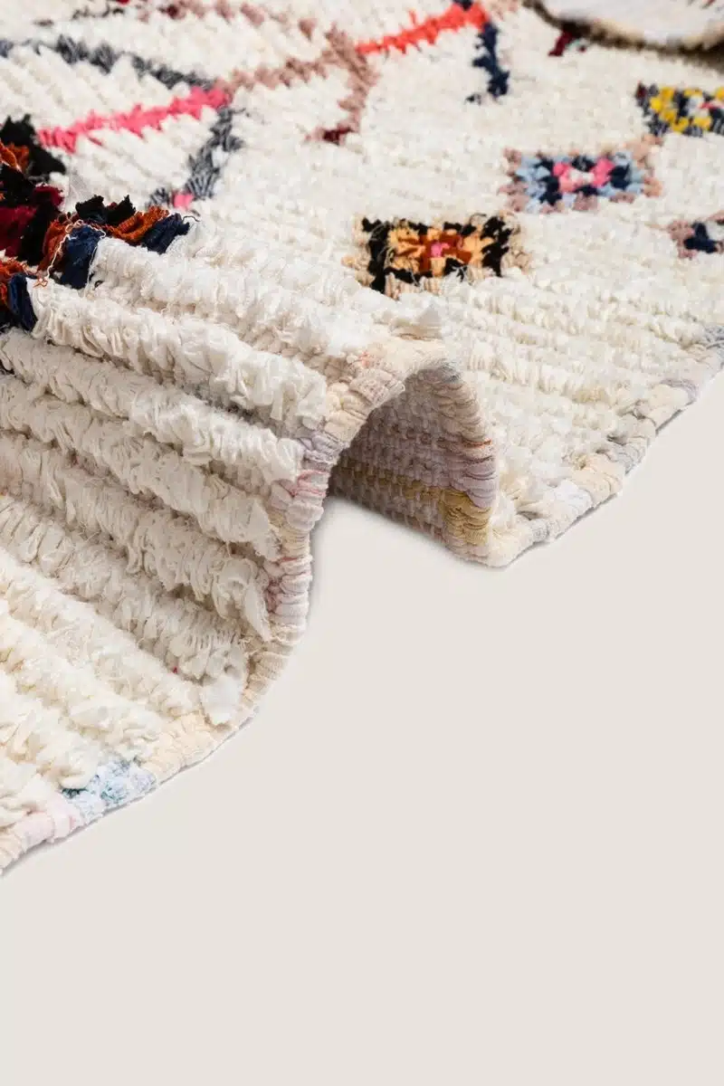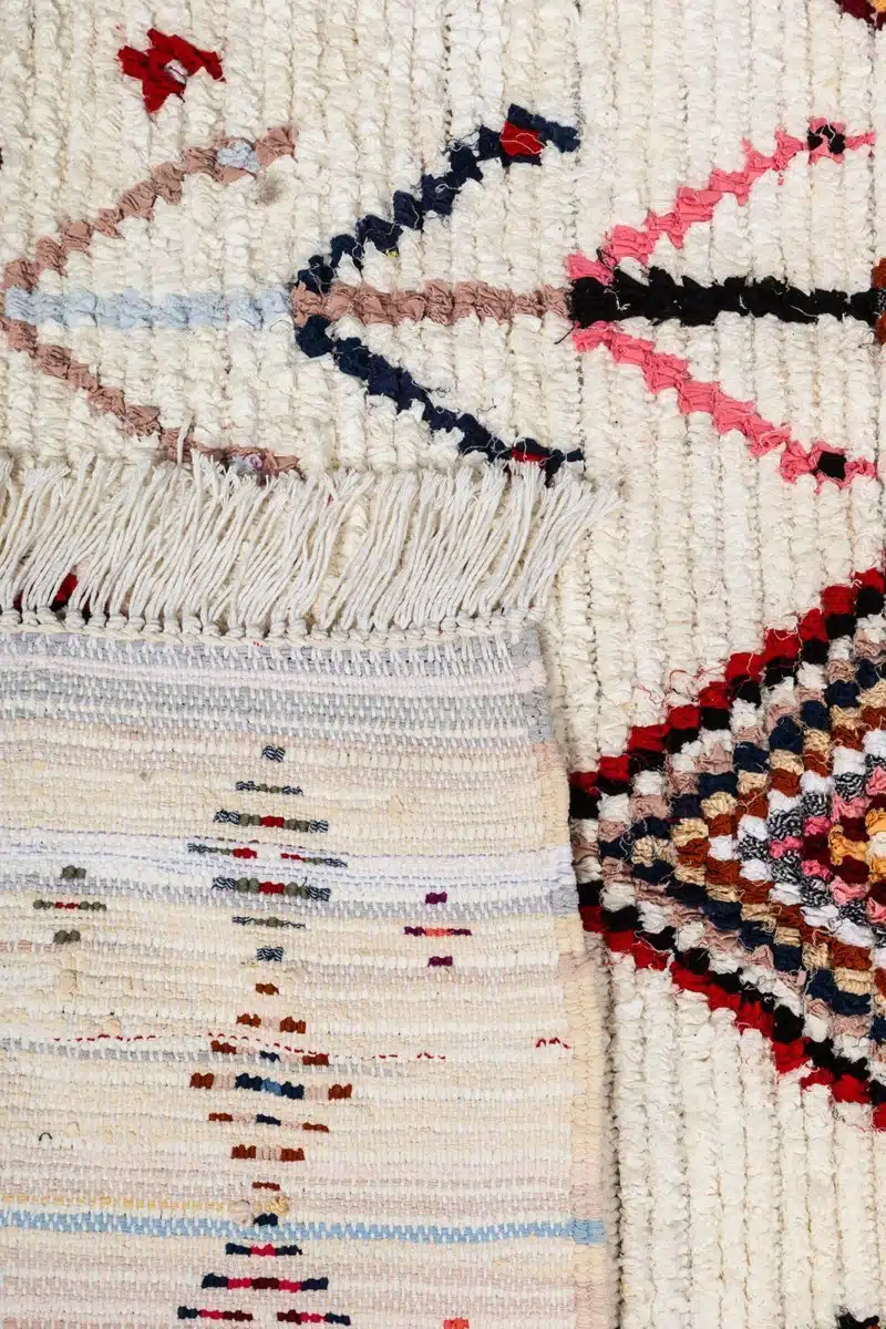 שטיח בושרוויט מרוקאי בעבודת יד, עשוי ממחזור של טקסטיל כותנה, מה שהופך אותו לרך וידידותי לסביבה. העיצוב כולל רקע לבן עם דוגמאות יהלום גיאומטריות וצורות מופשטות, המשקפות את האומנות הברברית המסורתית. מרקמו הקליל והנעים הופך אותו לתוספת מושלמת לעיצוב פנים מודרני או בוהמייני.